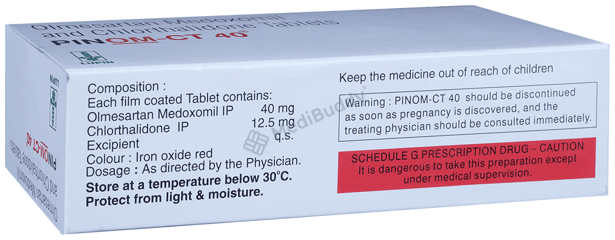 Pinom CT 40 Tablet offers several benefits in managing hypertension (high blood pressure). This medication is a blend of two active ingredients – Olmesartan and chlorthalidone. Olmesartan functions by easing and dilating blood vessels, facilitating smoother blood flow throughout the body. As a result, this helps in lowering blood pressure levels effectively. On the other hand, chlorthalidone acts as a diuretic, promoting increased urine output which in turn aids in reducing blood pressure. When conventional medications fail to adequately control blood pressure, Pinom CT 40 Tablet comes into play.