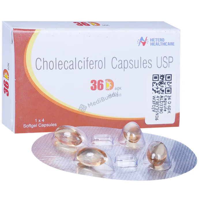 36 D 60K Capsule is a supplement containing Cholecalciferol, also known as Vitamin D3, which plays a crucial role in increasing the levels of vitamin D in the body. This supplement is specifically designed to address low levels of vitamin D and to compensate for any deficiencies that may be present. Vitamin D is essential for maintaining healthy bones and assists the body in efficiently absorbing calcium from both food sources and supplements. By taking vitamin D in conjunction with calcium, bone loss conditions like osteoporosis can be effectively managed. Additionally, in cases of kidney disease, this supplement helps regulate calcium levels and support proper bone development.