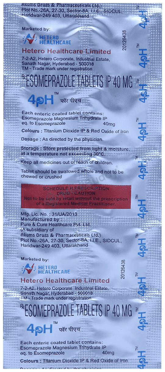 4PH 40mg Tablet is a medication used to address conditions associated with excessive stomach acid production, including gastroesophageal reflux disease (GERD), peptic ulcer disease, and Zollinger-Ellison syndrome. This tablet works by reducing the amount of acid generated in the stomach, thereby alleviating symptoms and supporting the healing process. It can also serve as a preventive measure for stomach ulcers induced by specific medications like nonsteroidal anti-inflammatory drugs (NSAIDs). It is essential to take this medication according to your doctor's instructions, with the dosage tailored to your particular condition. Typically, it is recommended to take 4PH 40mg Tablet on an empty stomach, preferably in the morning or at least one hour before a meal. It is important to continue the medication regimen even if symptoms abate, until advised by your healthcare provider to discontinue. In cases of prolonged usage, routine tests to monitor magnesium levels may be necessary due to potential decreases caused by the medicine.