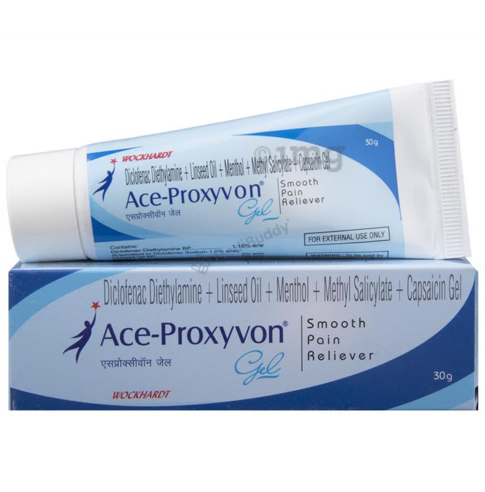 Ace-Proxyvon Gel is a fast-acting pain reliever that contains Diclofenac, Benzyl Alcohol, Capsaicin, Methyl salicylate, Linseed oil, and Menthol as active ingredients. This analgesic gel is specifically formulated to alleviate pain in areas such as the knee, back, shoulder, and neck.