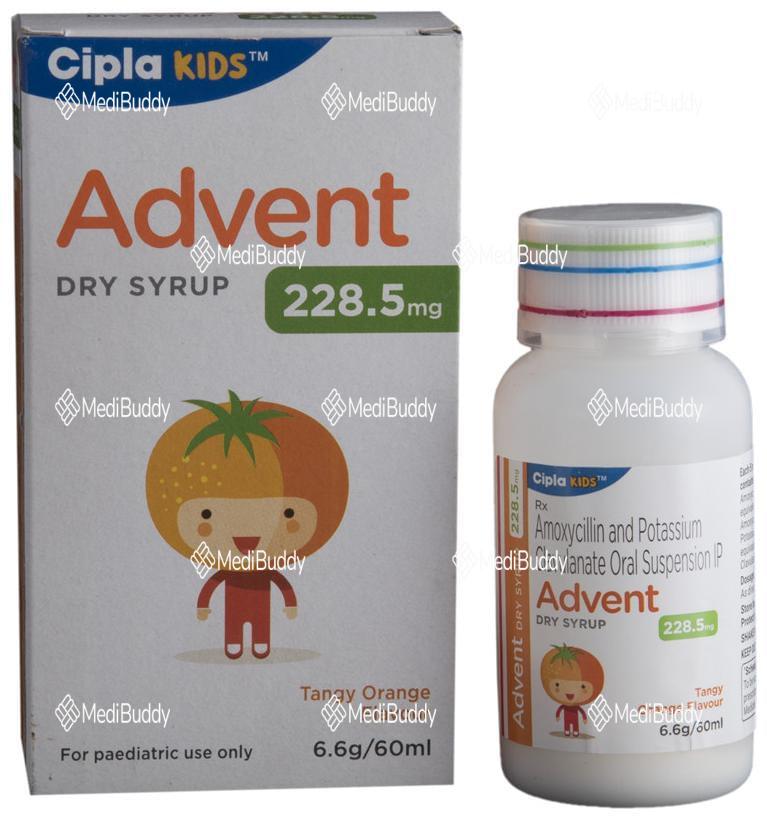 Advent 228.5mg Dry Syrup is generally well-tolerated by children with no serious side effects reported. However, there are some common side effects that may occur which include abdominal pain, allergy, vomiting, nausea, diarrhea, mucocutaneous candidiasis, skin rashes, itching, raised itchy rash (hives), indigestion, dizziness, headache, diarrhoea, thrush, erythema multiforme, reversible leucopoenia, and reversible thrombocytopenia.