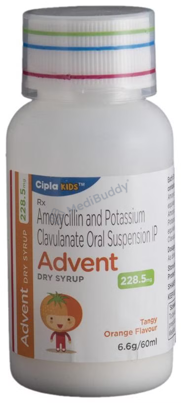 Advent 228.5mg Dry Syrup is an antibiotic medication used to combat bacterial infections affecting various parts of the body like the ear, nose, throat, chest, lungs, teeth, skin, and urinary tract. It can also be effective against tuberculosis strains that are resistant to other treatments. The medicine contains a combination of Amoxicillin and Clavulanic acid, with Amoxicillin working to eliminate bacteria by hindering their cell wall formation, and Clavulanic acid aiding in reducing bacterial resistance. This dual action helps in effectively treating bacterial infections.