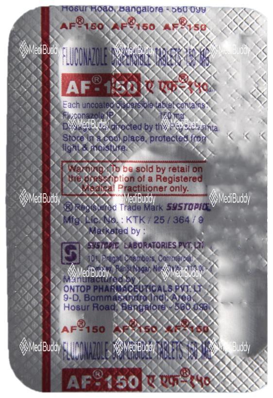 AF 150MG Tablet contains Fluconazole and belongs to a group of medicines called Anti-fungal agents. It is used to treat a range of fungal infections, from systemic candidiasis to vaginal candidiasis. This medication is also used to prevent fungal infections in patients at risk due to conditions like HIV infection or chemotherapy. Prior to taking AF 150MG Tablet, inform your doctor of any existing health issues, especially concerning liver, kidney, or heart function.