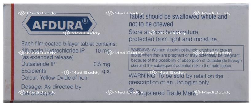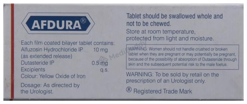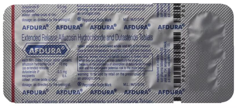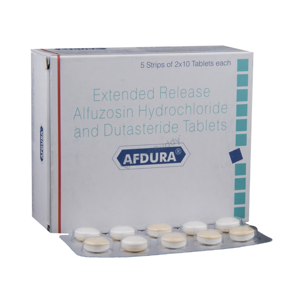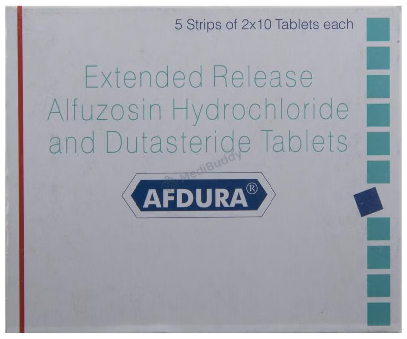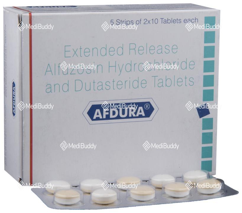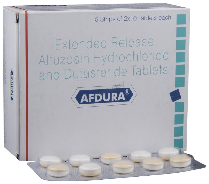 Afdura Tablet ER is a medication designed for men with an enlarged prostate gland, also known as Benign Prostatic Hyperplasia (BPH). This condition can cause symptoms such as difficulty urinating and the need to urinate more frequently. Afdura Tablet ER is a combination of two medicines, Alfuzosin and Dutasteride, which work in different ways to alleviate these symptoms. Alfuzosin, an alpha-blocker, relaxes the muscles in the prostate gland, making it easier to urinate. Dutasteride, a 5-alpha reductase inhibitor, reduces the size of the enlarged gland by decreasing the production of dihydrotestosterone hormone.