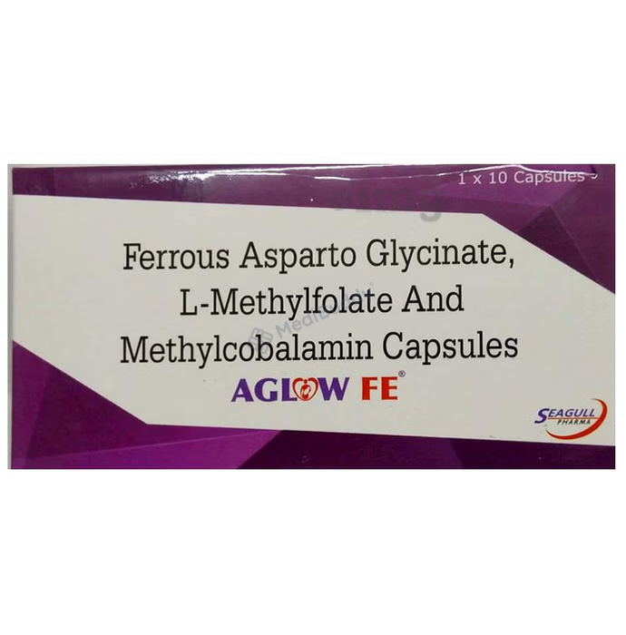 The key ingredients in Aglow Fe Capsule are Ferrous asparto glycinate, L-methyl folate, and Methylcobalamin. These ingredients work synergistically to elevate iron levels naturally in the body, thus aiding in maintaining optimal iron levels and preventing deficiencies. Iron plays a vital role in transporting oxygen throughout the body, supporting red blood cell production, and enhancing cellular energy utilization.