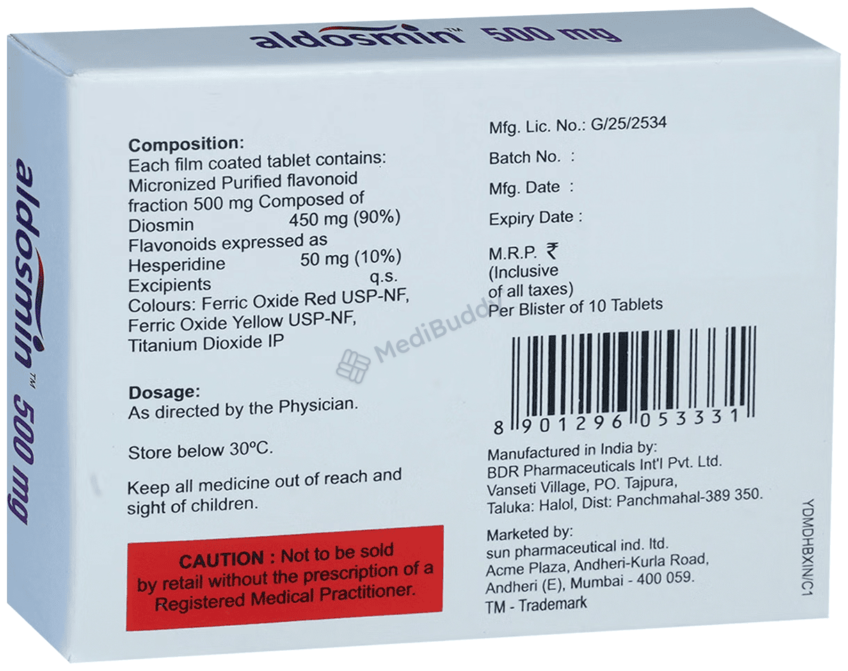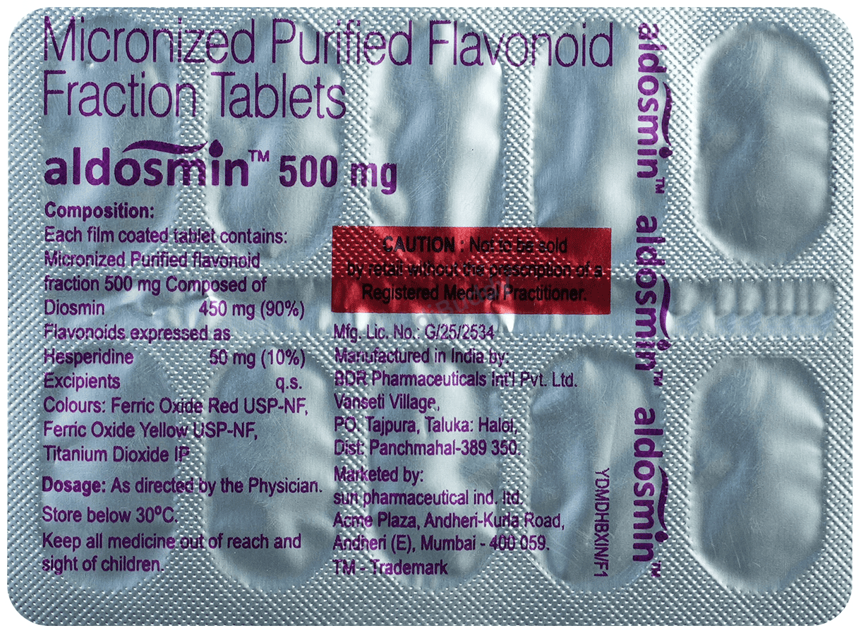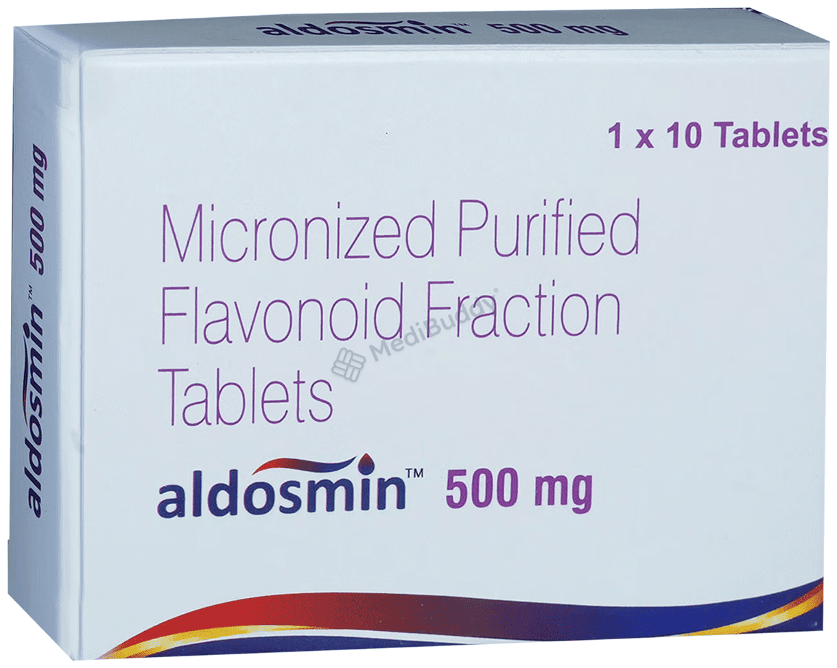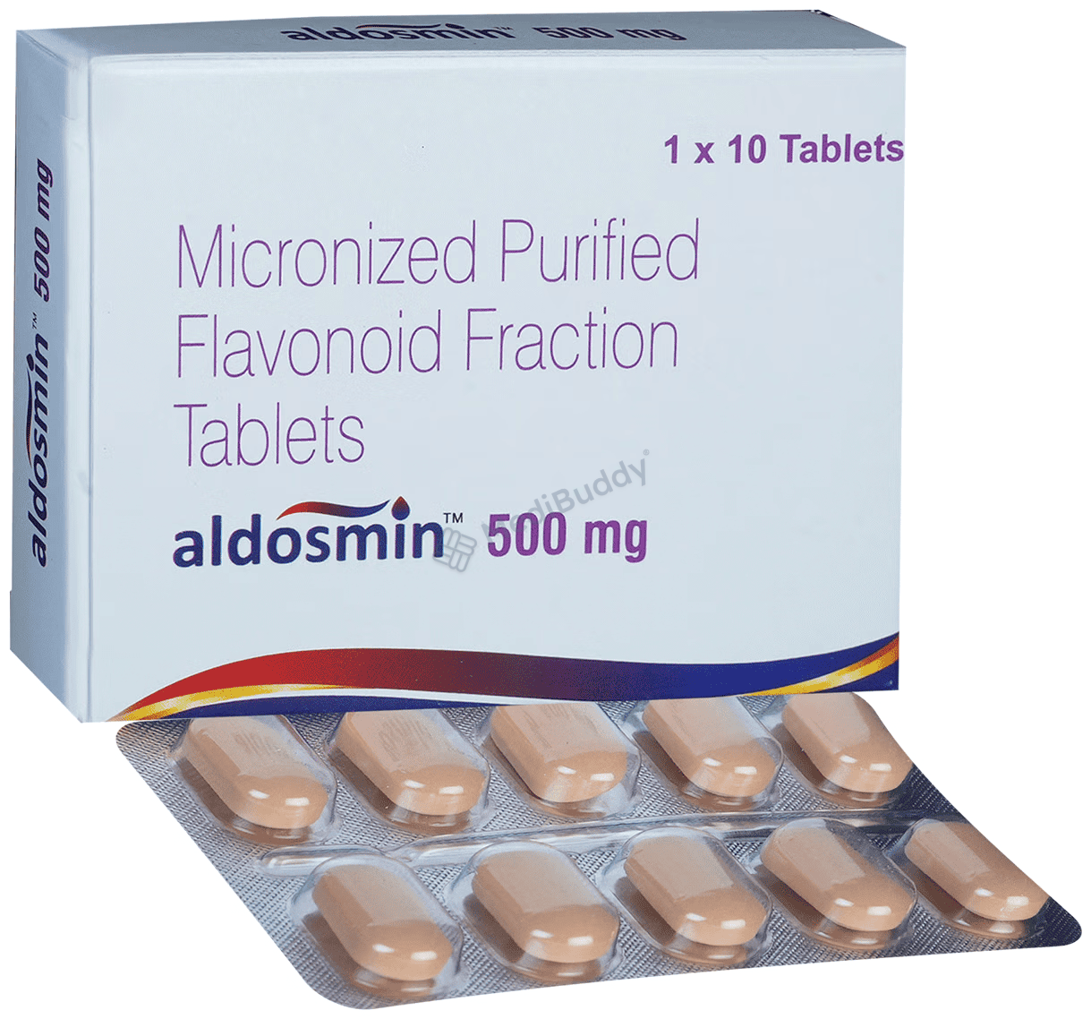 Aldosmin 500mg Tablet is a combinational medicine used to treat varicose veins and acute and chronic piles (hemorrhoids). This medication helps improve blood flow in the veins and restore their function. The tablet contains Diosmin and Hesperidine, which are Venotonic and Vasculoprotective agents respectively.