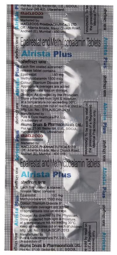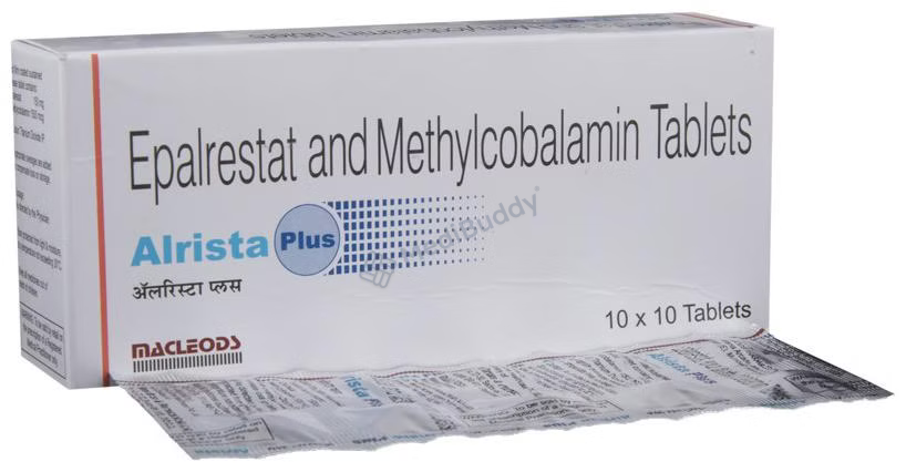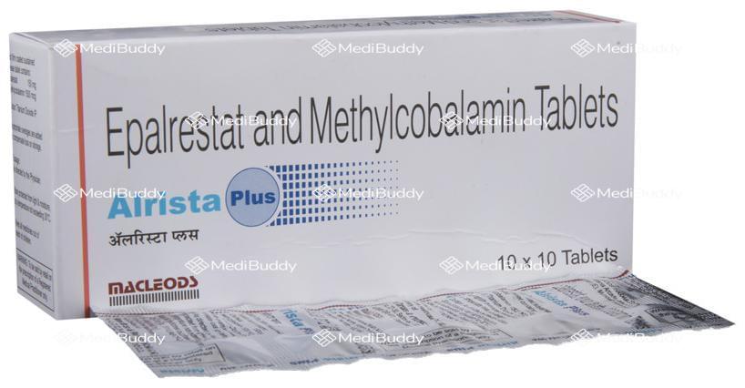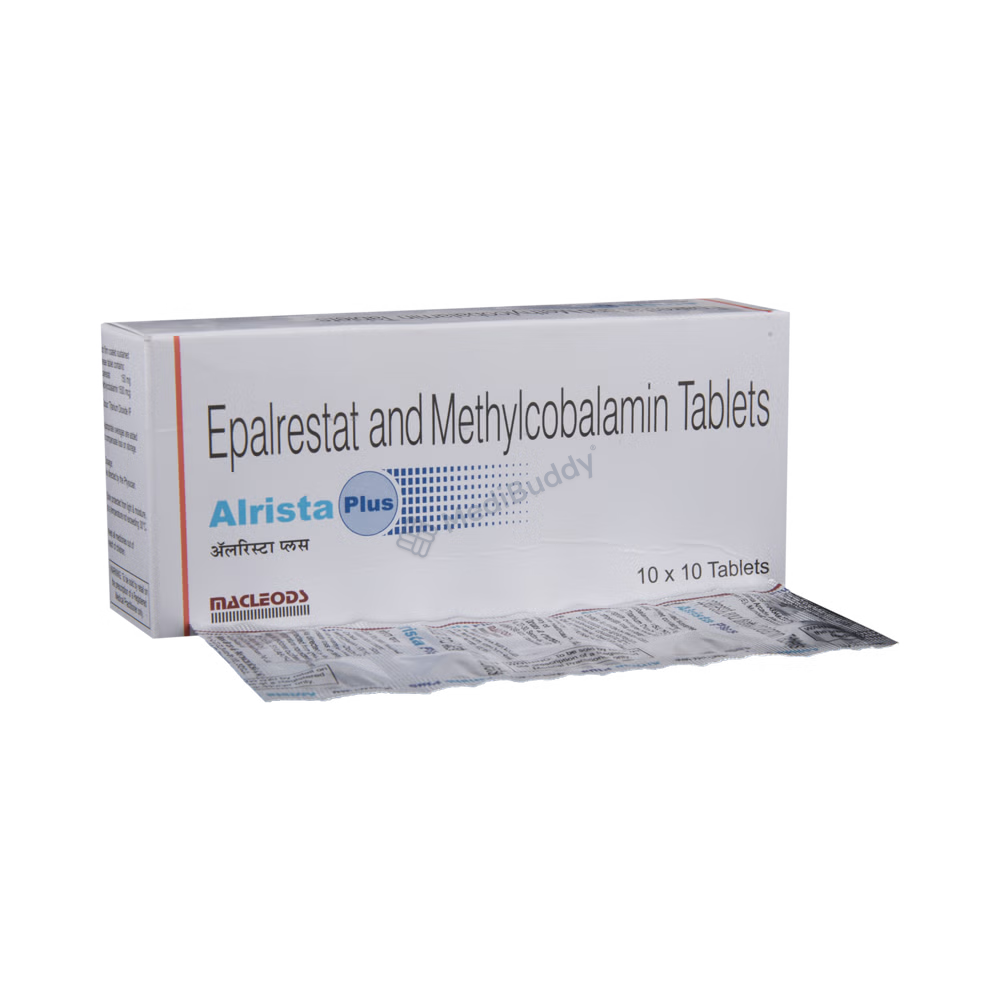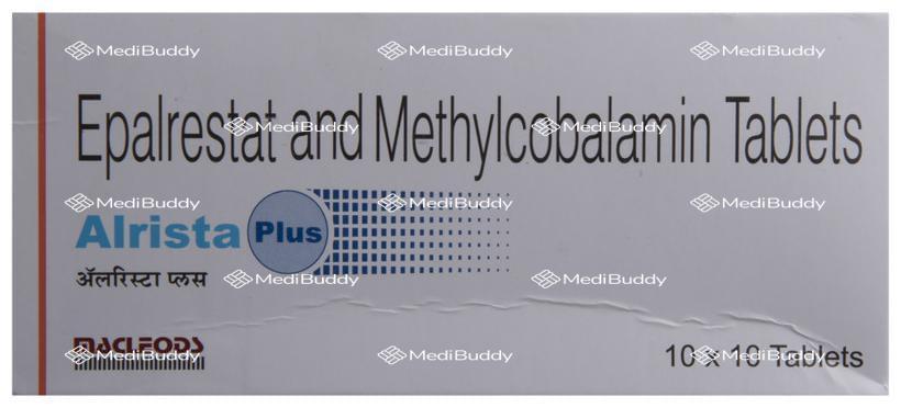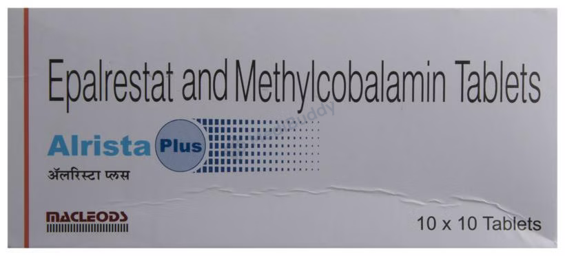 Alrista Plus Tablet 10's is a combination medication designed for the management of diabetic neuropathy, a condition wherein nerve damage results from elevated blood sugar levels. This chiefly affects nerves in the legs and feet and leads to diabetic neuropathic pain, commonly seen in individuals with type 1 and type 2 diabetes. Comprising Epalrestat and Methylcobalamin, Alrista Plus Tablet 10's functions by blocking the aldose reductase enzyme, crucial in converting glucose to sorbitol, thus preventing sorbitol accumulation linked to hyperglycemia-induced nerve pain. Methylcobalamin aids in the repair and safeguarding of impaired nerve cells by promoting myelin production. Alrista Plus Tablet 10's is to be taken as per your doctor's prescription, depending on your medical condition. Some individuals may experience mild side effects like nausea, vomiting, diarrhea, dizziness, and headache, which typically diminish with time. Pregnant or breastfeeding individuals should consult their healthcare provider before using Alrista Plus Tablet 10's. Driving should be avoided if drowsiness or dizziness occurs. This medication is not recommended for children due to limited safety data. Alcohol consumption alongside Alrista Plus Tablet 10's is best avoided to minimize the risk of increased drowsiness and dizziness. Inform your doctor about your health status and medications to avoid potential side effects or interactions.