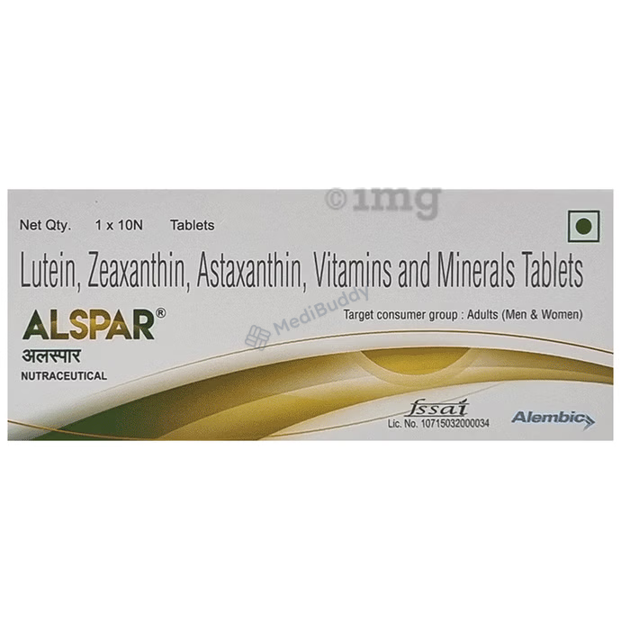 Alspar Tablet is a nutritional supplement designed to support eye health by combining powerful ingredients such as Astaxanthin, Copper, Zinc, Lutein, Vitamin B12, Vitamin D, and Zeaxanthin. These active components work together to shield the eyes from harmful high-energy light waves, like ultraviolet rays in sunlight. Additionally, they help in preventing macular degeneration and boosting immune functions.