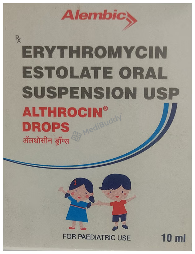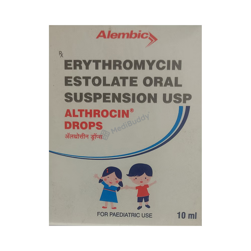 Althrocin Drops 10ml belongs to a class of antibiotics known as macrolides and is commonly used to treat conditions such as pneumonia, acne, dental abscesses, and certain sexually transmitted infections. In children, Althrocin Drops 10ml is often prescribed for ear or chest infections caused by bacteria. Erythromycin, the active ingredient in Althrocin Drops 10ml, works by inhibiting the growth of harmful bacteria, ultimately leading to their elimination. It is essential to follow the prescribed dosage and complete the full course of treatment even if symptoms improve, to prevent the risk of reinfection or worsening condition.