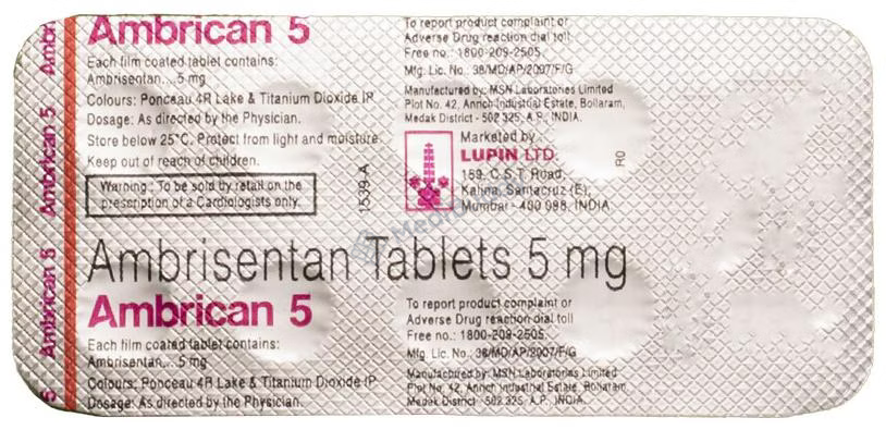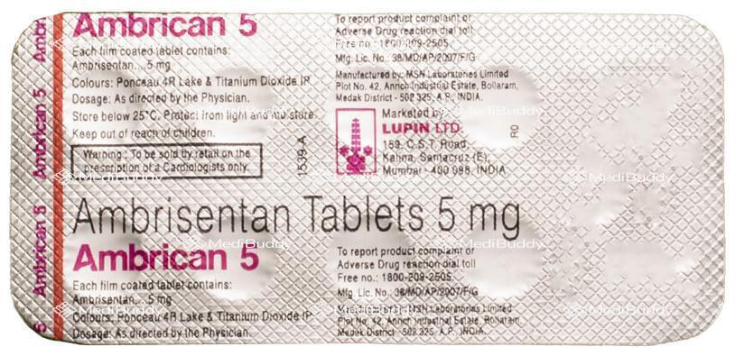 Ambrican 5 Tablet is a prescription medication that falls under the category of anti-hypertensive drugs. It is primarily used to treat pulmonary arterial hypertension, which is a condition characterized by high pressure in the blood vessels that carry blood from the heart to the lungs. This medication contains Ambrisentan, which is classified as an endothelin receptor blocker. Ambrisentan works by inhibiting the action of Endothelin, a natural substance that constricts blood vessels and raises blood pressure.