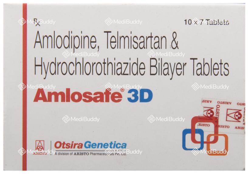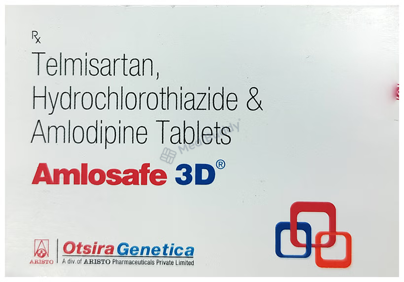 Amlosafe 3D Tablet is primarily used to treat hypertension, which is a condition characterized by high blood pressure. This medication combines three active ingredients - Telmisartan 40mg, Amlodipine 5mg, and Hydrochlorothiazide 12.5mg - to effectively manage high blood pressure. Telmisartan helps relax blood vessels, while Amlodipine widens them to improve blood flow. Hydrochlorothiazide works by removing excess salt and water from the body, further reducing blood pressure. The synergistic action of these three components helps in controlling and regulating blood pressure levels in individuals diagnosed with hypertension. It is important to take this medication as prescribed by a healthcare professional to achieve the desired therapeutic effects.