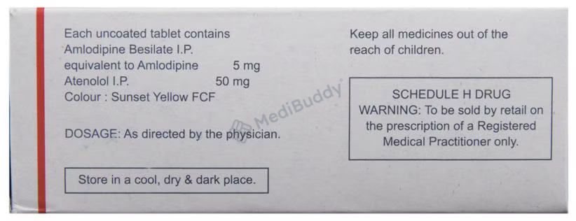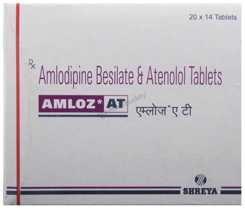 Amloz AT Tablet contains Amlodipine, a calcium channel blocker, and Atenolol, a beta-blocker. Amlodipine works by relaxing and widening constricted blood vessels, reducing the heart's workload and making it more efficient at pumping blood. Atenolol blocks stress hormones, slowing down the heart rate. This combined action helps lower blood pressure, reducing the risk of heart attacks or strokes in the future. Follow your doctor's prescription for Amloz AT Tablet and report any persistent side effects to your healthcare provider.