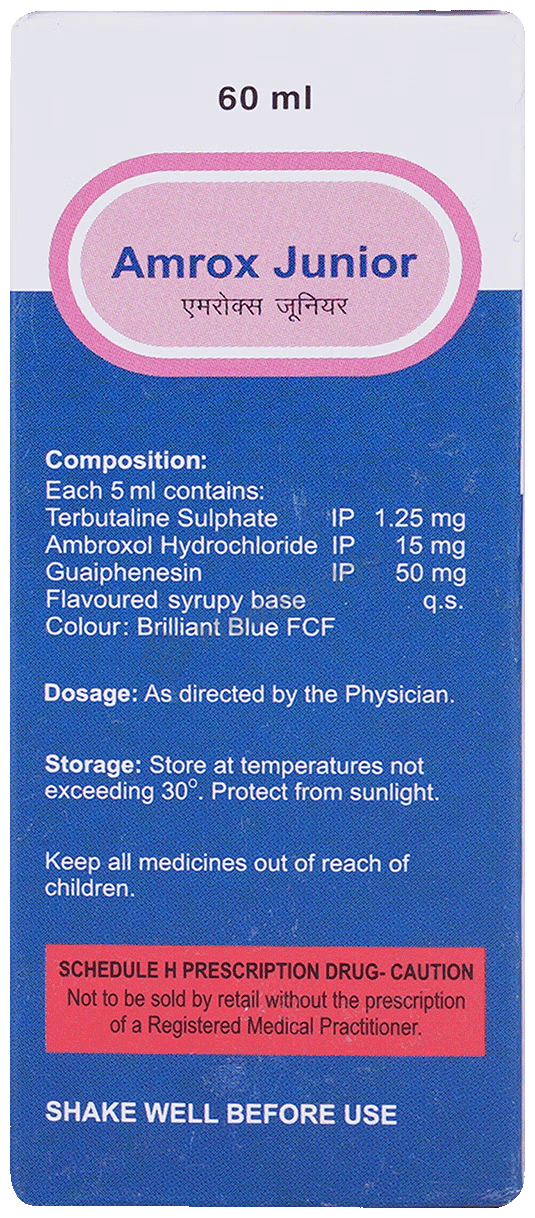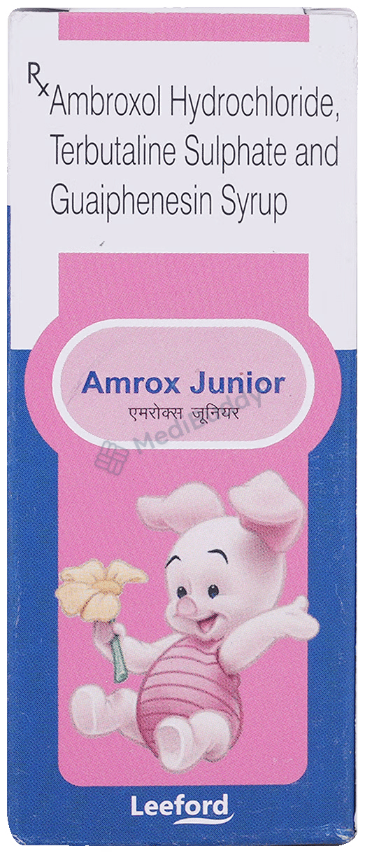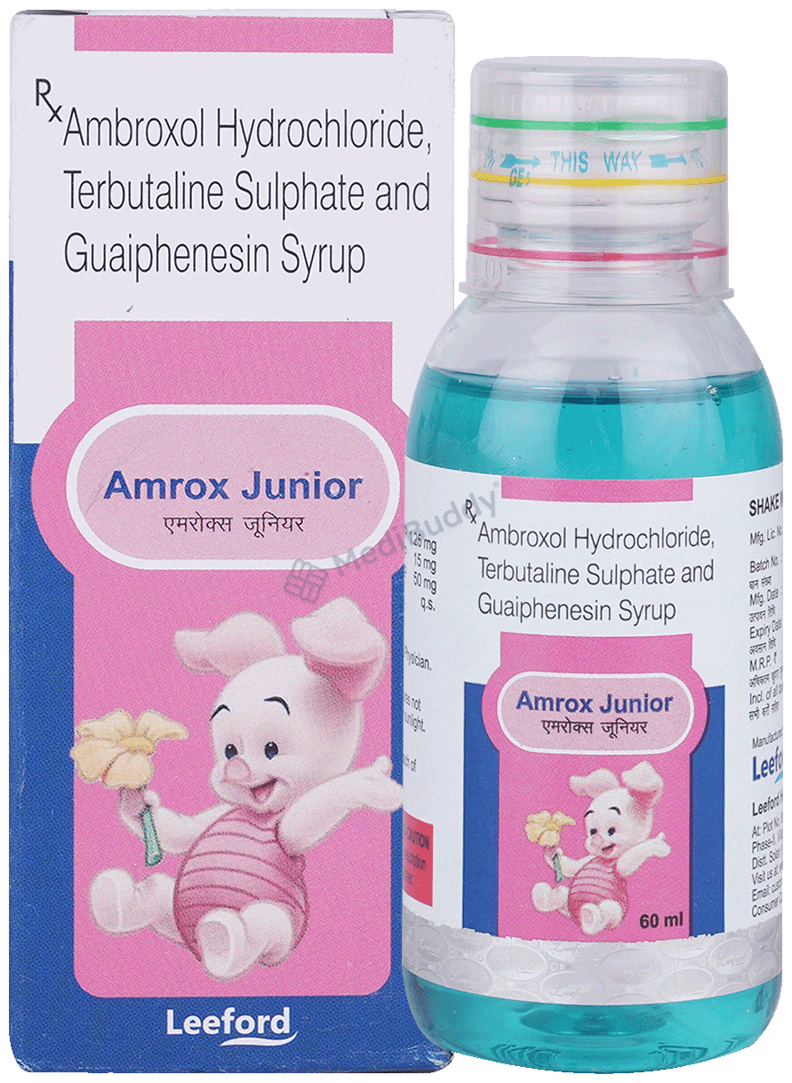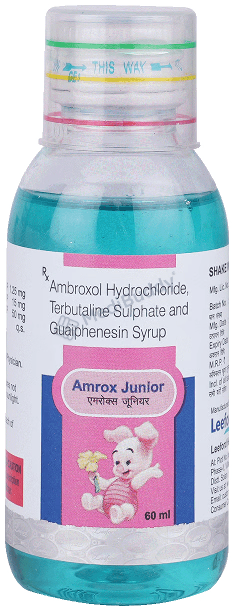 Amrox Junior Syrup is a combination of three drugs—Ambroxol (a mucolytic agent), Guaifenesin (an expectorant), and Terbutaline (a bronchodilator). Ambroxol works by thinning and loosening phlegm in the lungs, windpipe, and nose, while Guaifenesin increases the fluid volume in the airways, reduces the stickiness of mucus, and helps in its removal. Terbutaline acts as a bronchodilator by relaxing muscles and widening the airways to facilitate easier breathing. It is essential to take Amrox Junior Syrup as prescribed by the doctor, considering the individual’s medical condition.