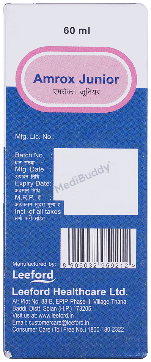Amrox Junior Syrup effectively treats wet cough (cough with mucus) in children. It helps in thinning the mucus by increasing its water content, relieving throat irritation and clearing congestion. Giving this syrup to your child as prescribed for a few days to weeks is important for managing the clinical condition and severity of the illness. Do not abruptly stop the medication, and consult your child’s doctor before long-term use. Excessive salivation, fatigue, headache, and other temporary side effects may occur, which usually resolve as the body adjusts to the medicine. Monitor your child for any discomfort and contact the doctor if needed.
