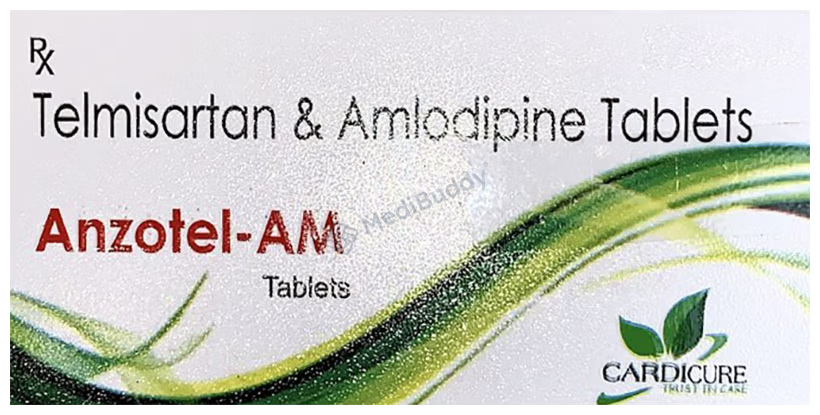 Anzotel-AM Tablet is used to treat high blood pressure. The two medicines in this tablet help relax blood vessels, making it easier for the heart to pump blood, thereby reducing the risk of heart attacks or strokes. It is important to take this medicine regularly at the same time each day as prescribed by your doctor. Even if you feel well, continue taking it to lower the risk of heart issues. Making lifestyle changes like staying active and following a low-salt, low-fat diet can enhance the medication's effectiveness. Common side effects may include swelling in ankles or feet, headache, dizziness, and upset stomach. Consult your doctor for persistent side effects. Prior consultation is necessary for individuals with kidney or liver issues, severe dehydration, pregnant, or breastfeeding. Regular monitoring of blood pressure and kidney function is required while taking this medicine.