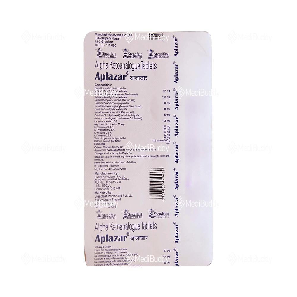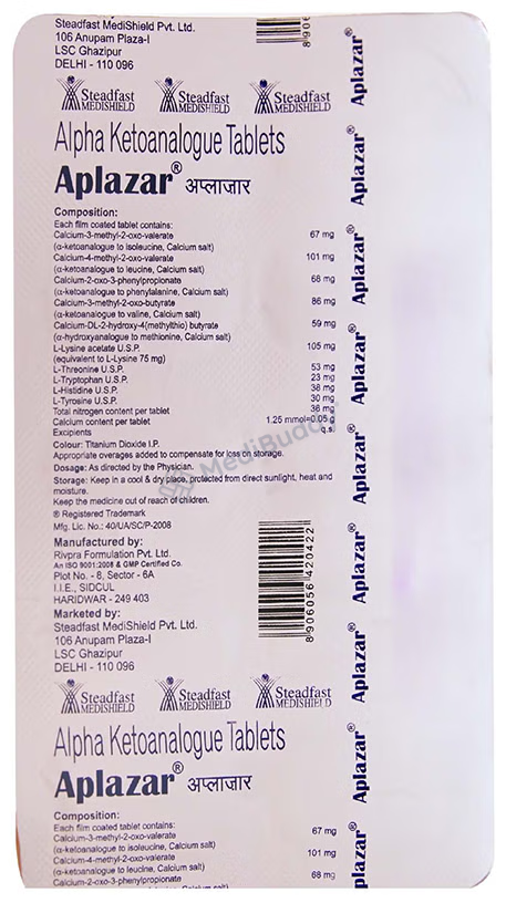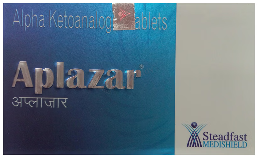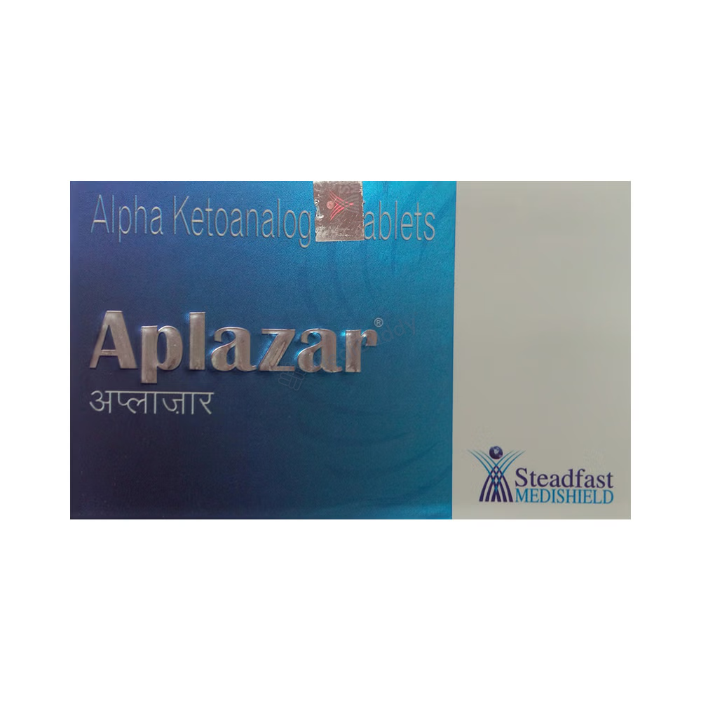 Aplazar Tablet is used for chronic kidney disease treatment. It lowers blood urea levels, helping prevent disease progression and delaying the need for long-term dialysis. It combines essential amino acids, slowing CKD progression when paired with a low protein diet. This helps eliminate urea and enhances kidney function, improving overall quality of life. Strictly adhere to your doctor's advice for optimal results. Regular monitoring is crucial.