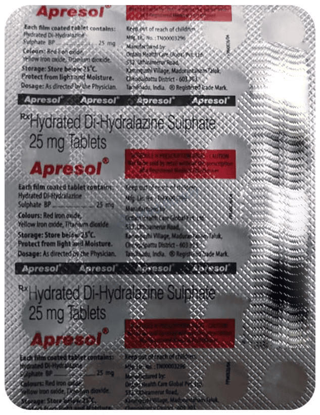 Apresol Tablet is a medication categorized under vasodilators, which are drugs that relax and widen specific small blood vessels. This action helps in enhancing the flow of blood through the vessels, making it easier for the blood to circulate. The primary purpose of Apresol Tablet is to manage hypertension, commonly known as high blood pressure. Additionally, it may also be prescribed in conjunction with other medications for the treatment of heart failure.