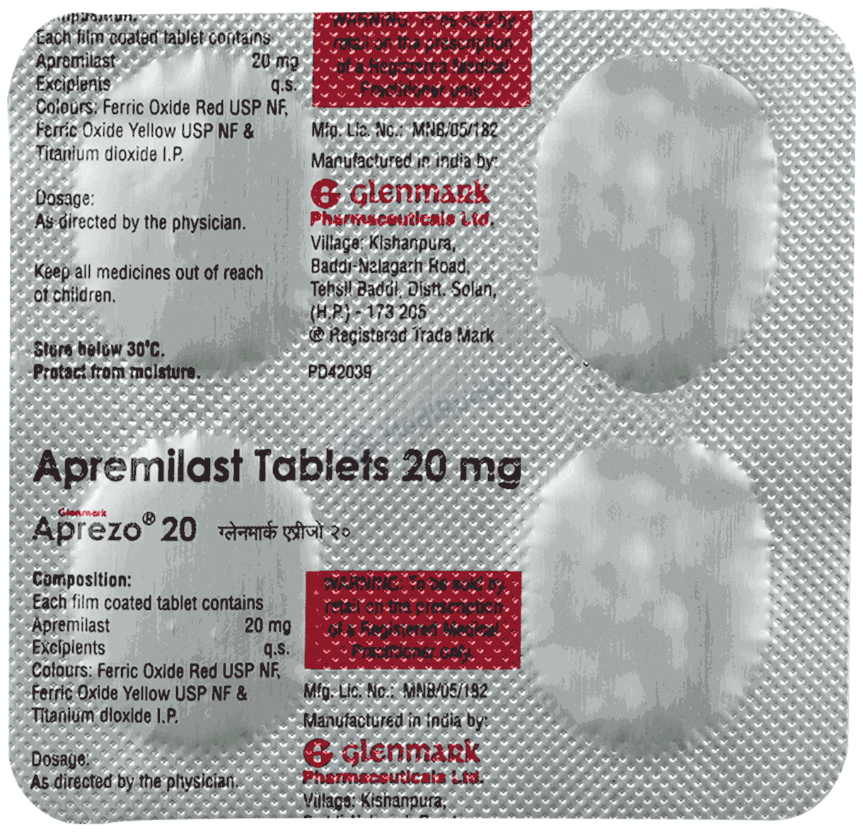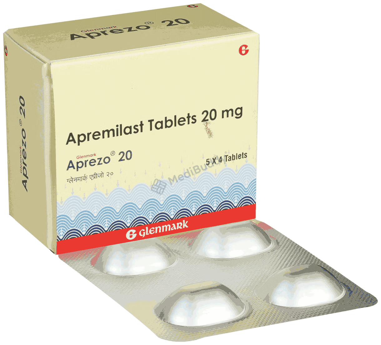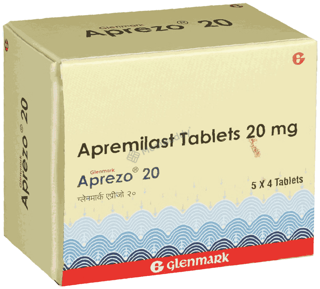 Aprezo 20 Tablet is a medication used in the treatment of moderate to severe plaque psoriasis, a type of skin condition that causes scaly, itchy, and red patches on the skin. This medicine is typically prescribed when other conventional treatments are not effective or if the patient cannot tolerate them. Aprezo 20 Tablet belongs to a class of drugs known as phosphodiesterase 4 (PDE4) inhibitors and works by blocking certain chemical messengers responsible for inflammation related to psoriatic arthritis and psoriasis, thereby reducing the signs and symptoms of these conditions.