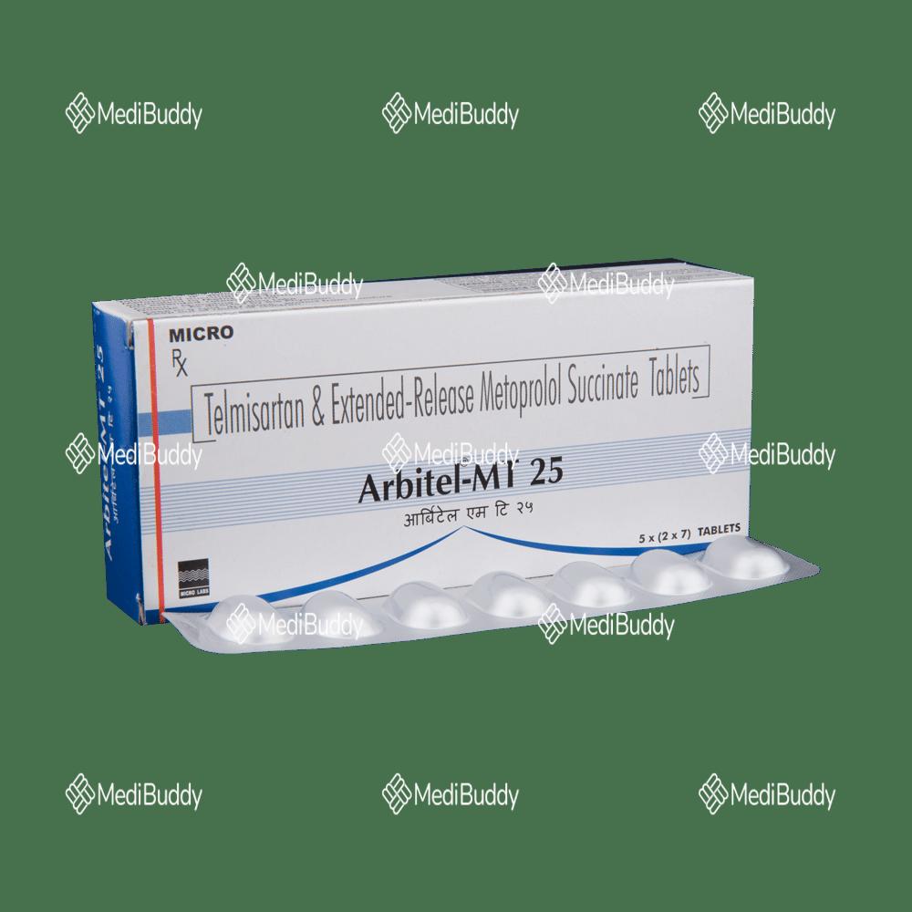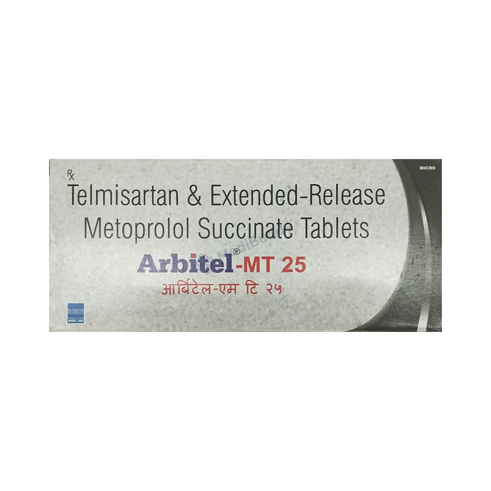 Arbitel-MT 25 Tablet ER is a medication primarily utilized for managing high blood pressure. It plays a crucial role in reducing the risk of potential heart attacks and strokes by lowering blood pressure levels effectively. When taken consistently with a meal at the same time daily, it helps maintain a steady concentration of the medicine in the bloodstream, ensuring optimal effectiveness. Following your doctor's guidance on the duration of treatment is essential, even if you feel well, as high blood pressure can often be asymptomatic. Abruptly discontinuing the medication without medical advice may lead to worsening of your condition.