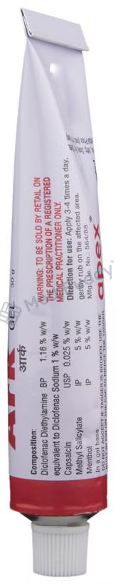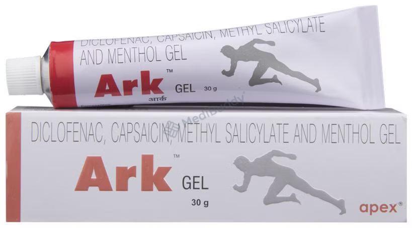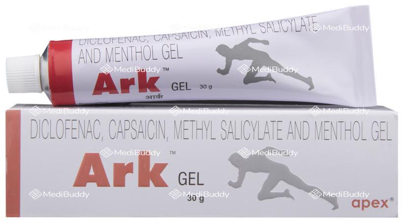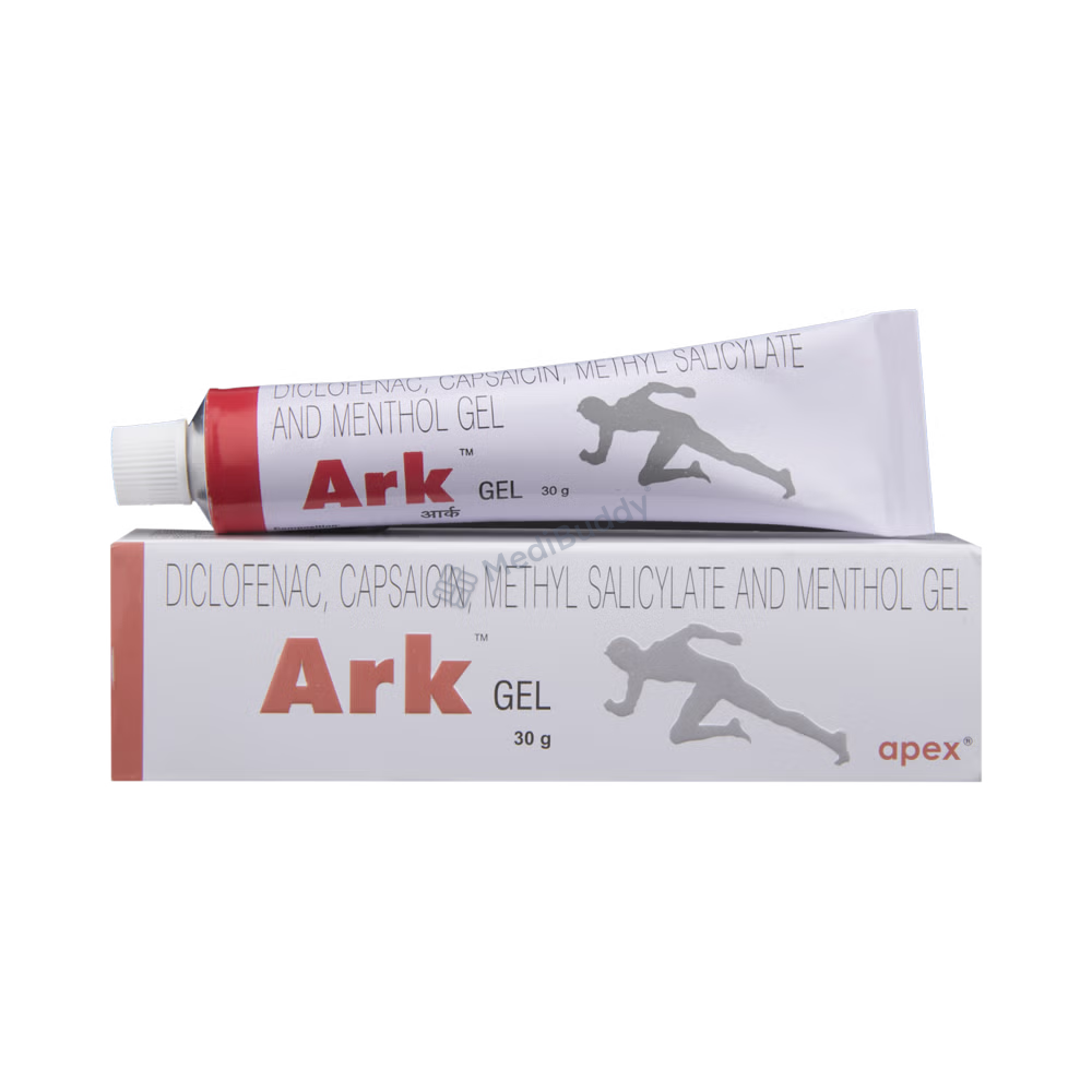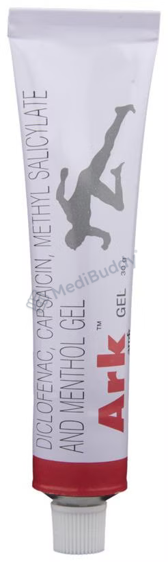 Ark Gel is a topical medication used to relieve pain associated with muscle or joint injuries such as sprains, strains, sports injuries, rheumatoid arthritis, and osteoarthritis. It comes in a gel form and contains key ingredients such as Diclofenac, Capsaicin, Methyl Salicylate, and Menthol.