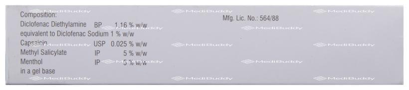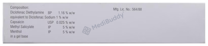 Diclofenac is a nonsteroidal anti-inflammatory drug (NSAID) that helps in reducing pain, swelling, and inflammation by inhibiting the synthesis of prostaglandins. Capsaicin, derived from capsicum, helps in relieving pain and inflammation by decreasing the intensity of pain signals in the body. Methyl Salicylate reduces inflammation, while Menthol provides temporary relief from minor pain by targeting specific receptors in the brain.