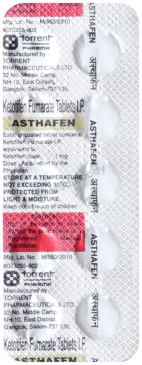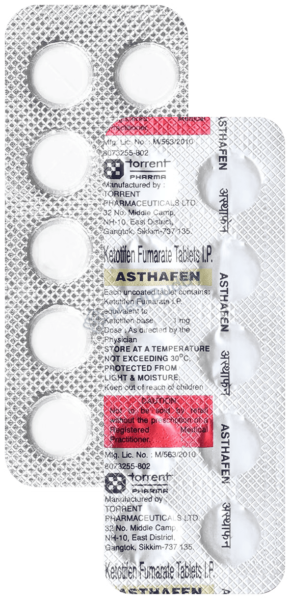 In the prophylactic treatment of bronchial asthma and allergic conditions like rhinitis, Asthafen Tablet containing Ketotifen, an antihistamine, is helpful. Bronchial asthma is a condition that causes the airways to narrow and swell, leading to difficulty in breathing, coughing, wheezing, and shortness of breath. Be sure to follow your doctor's instructions on how to take Asthafen Tablet based on your medical condition. It is important to inform your doctor of any allergies, medical history, or medications you are currently taking before starting treatment with Asthafen Tablet.