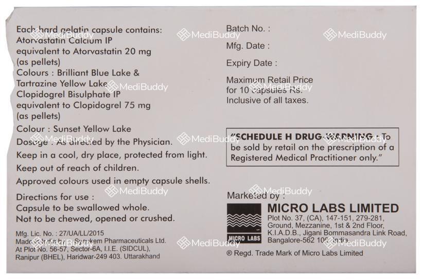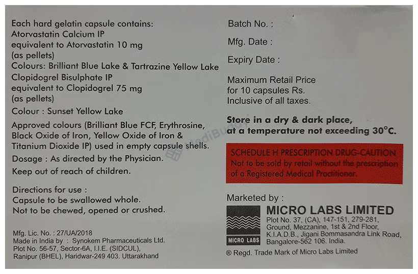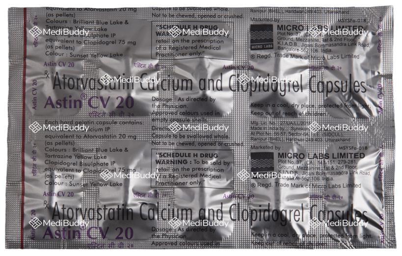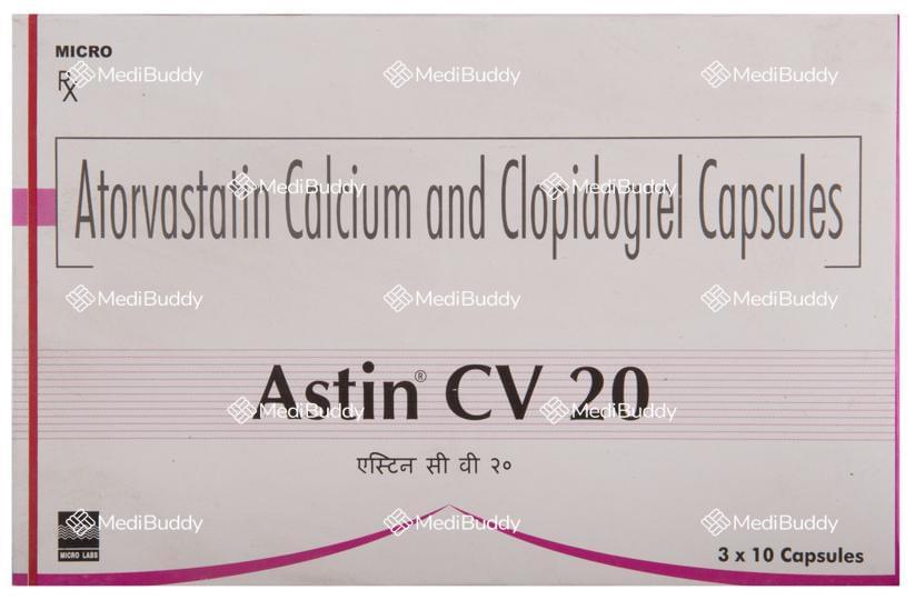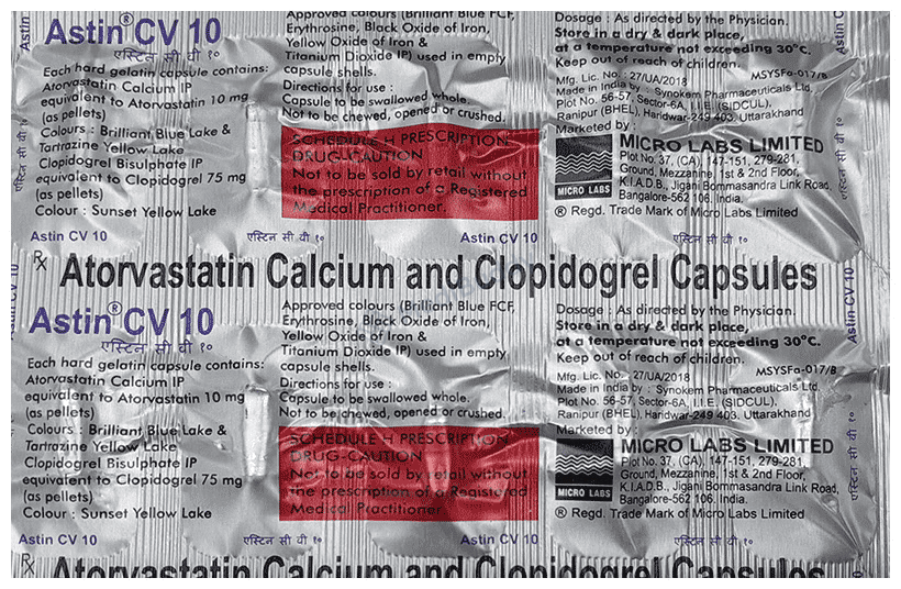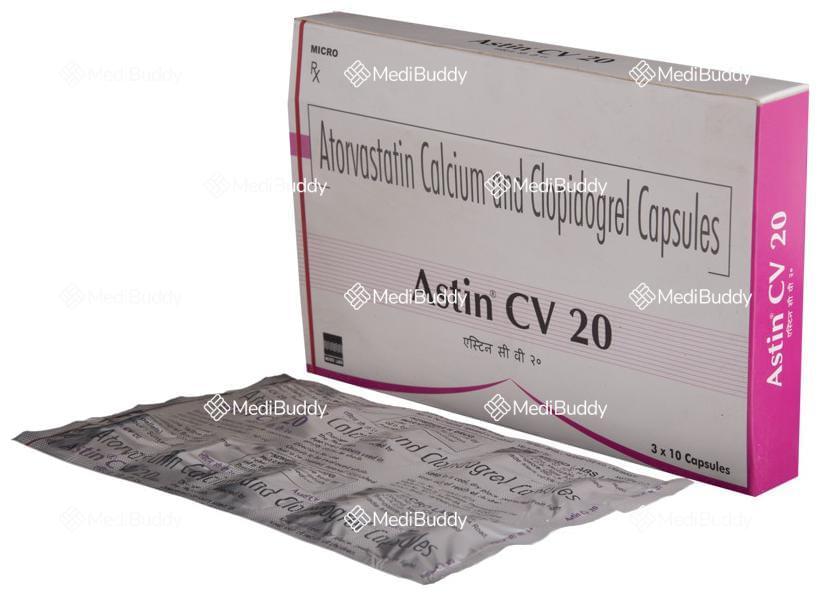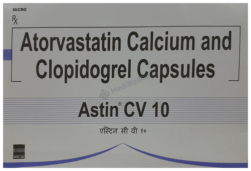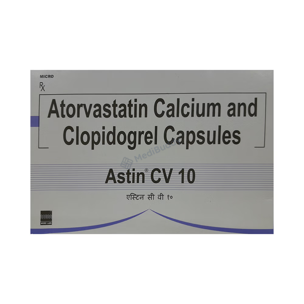 Astin CV 10 Capsule is a medication that combines two active ingredients, Atorvastatin and Clopidogrel, to help prevent heart attacks and strokes. The primary purpose of this medicine is to lower the levels of "bad" cholesterol (LDL) and triglycerides in the body. Additionally, it works to reduce the formation of blood clots, which can lead to serious cardiovascular issues.