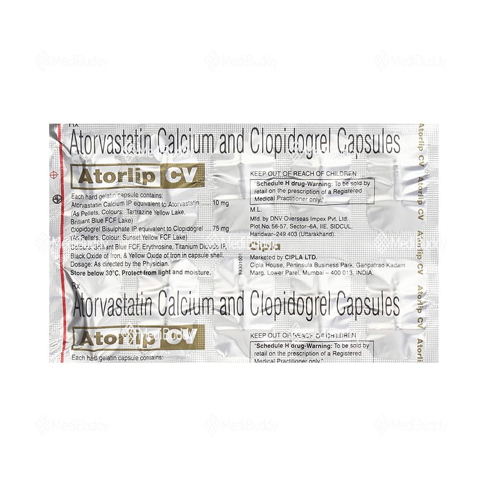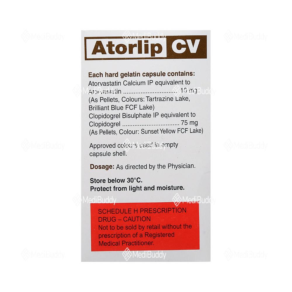 Atorlip CV Capsule is used for preventing heart attacks and strokes by lowering "bad" cholesterol and triglyceride levels in the body. This medication also helps reduce the formation of blood clots, decreasing the risk of heart diseases. To reduce stomach upset, it is advised to take Atorlip CV Capsule with food at regular intervals as prescribed by your doctor. Lifestyle changes, like a low-fat diet and exercise, can enhance the medicine's effectiveness. Be cautious of potential side effects such as nausea, abdominal pain, and headaches, and seek medical advice if they persist or worsen.