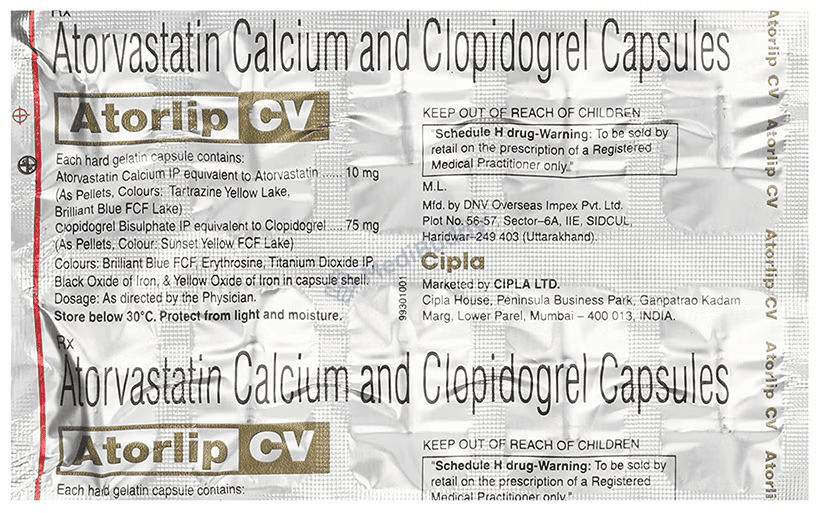 Before consuming Atorlip CV Capsule, it is essential to follow certain precautions. This medicine is used to lower the risk of heart attack and stroke by reducing "bad" cholesterol and triglyceride levels while also inhibiting blood clot formation. To prevent stomach upset, take Atorlip CV Capsule with food at regular intervals as directed by your doctor. Consistency in dosing, preferably at the same time each day, is important. It is crucial to complete the full prescribed course, even if symptoms improve.