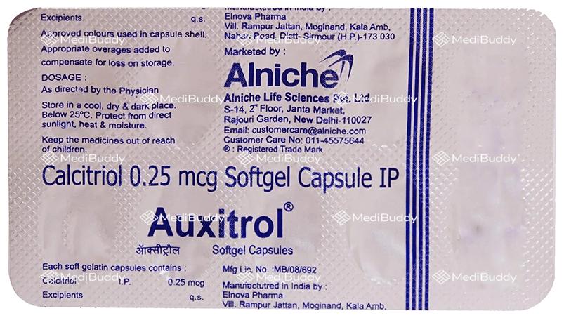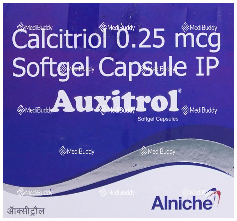 Auxitrol Softgel Capsule is a medication that may assist in managing hyperparathyroidism and maintaining healthy bones. It contains Calcitriol as a key ingredient, which plays a crucial role in relieving hyperparathyroidism, managing calcium deficiency, and aiding the body in absorbing more calcium from the diet. This enhanced calcium absorption helps in the formation of strong and healthy bones while reducing the risk of bone damage.