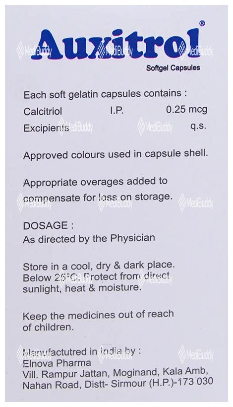 To ensure optimal benefits, it is vital to follow your doctor’s instructions when taking Auxitrol Capsule. Swallow the capsule with water and avoid crushing or chewing it. Regular blood tests may be recommended to monitor calcium levels in the blood. Additionally, this medication is not suitable for individuals with high calcium or vitamin D levels or excess calcium deposits in the body. In case of any allergic reactions while using Auxitrol Capsule, prompt consultation with your doctor is advisable.