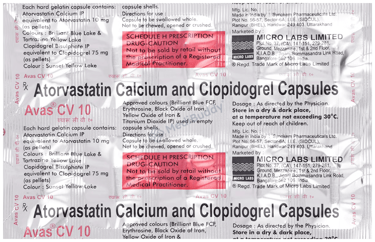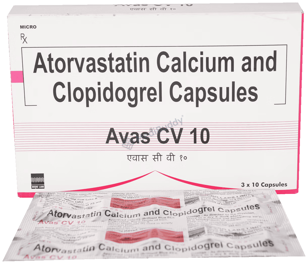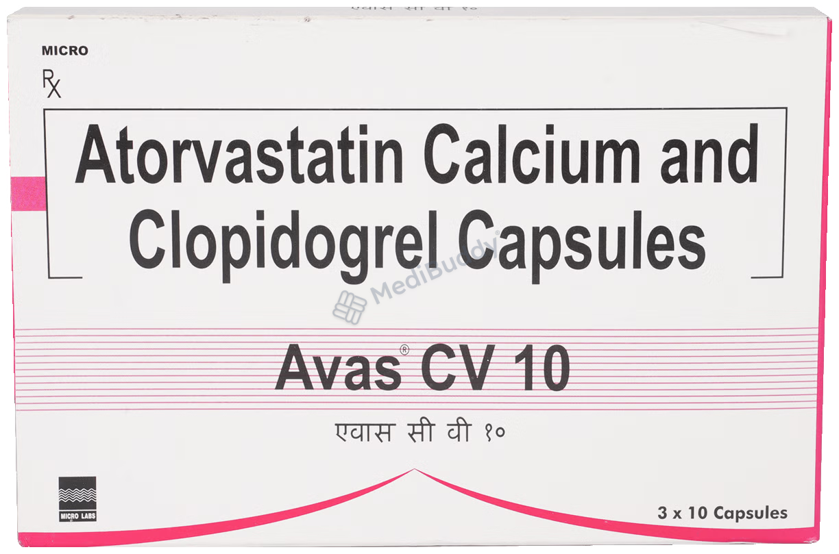 Avas CV 10 Capsule is a medication that combines two drugs to help prevent heart attacks and strokes. This capsule works by lowering the levels of "bad" cholesterol (LDL) and triglycerides in the body, as well as reducing the formation of blood clots. Heart attacks and strokes can occur when cholesterol and fats build up in the arteries, leading to blockages that restrict blood flow to the heart or brain.