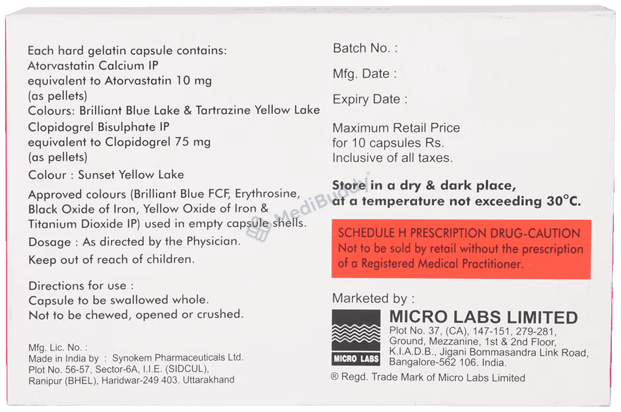 Clopidogrel works to inhibit the formation of blood clots and prevents existing clots from growing larger in size. This dual action of Avas CV 10 Capsule in lowering cholesterol levels and preventing clot formation makes it a valuable medication for individuals at risk of heart attacks.
