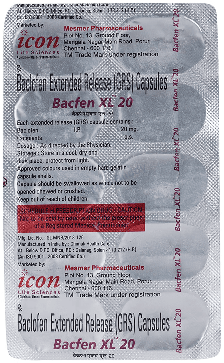 BACFEN XL 20MG CAPSULE, containing Baclofen, falls under the category of Muscle relaxants and is utilized to address muscle spasms triggered by conditions like cerebral palsy, multiple sclerosis, stroke, or other nerve or spinal cord disorders.