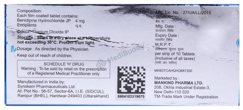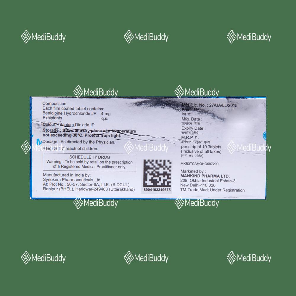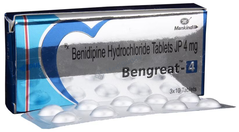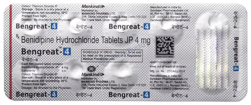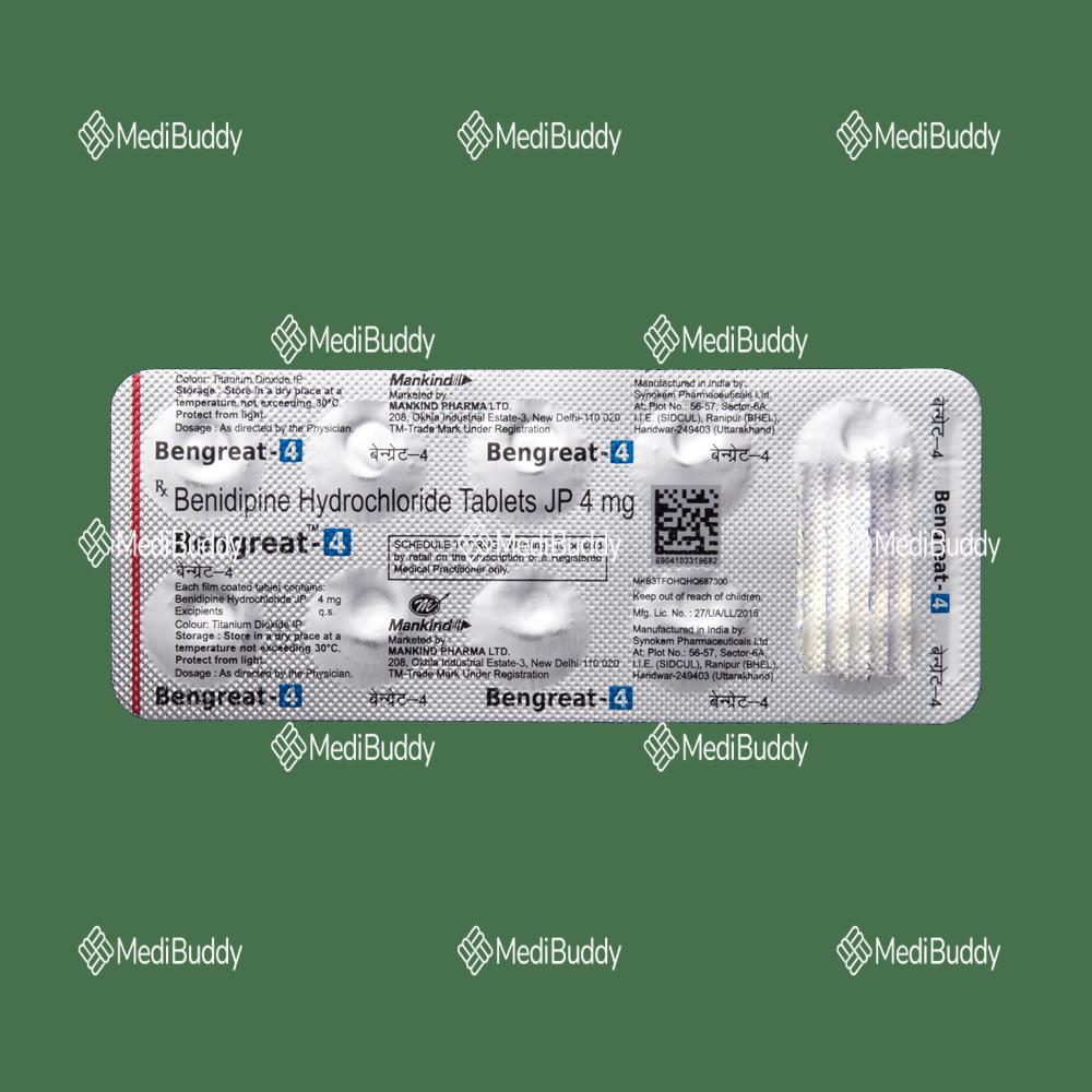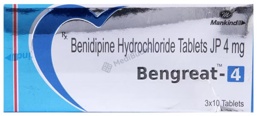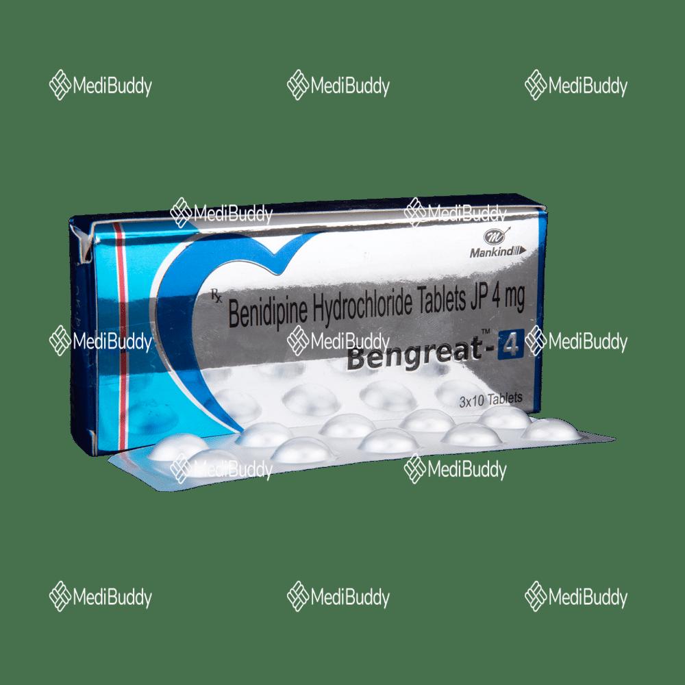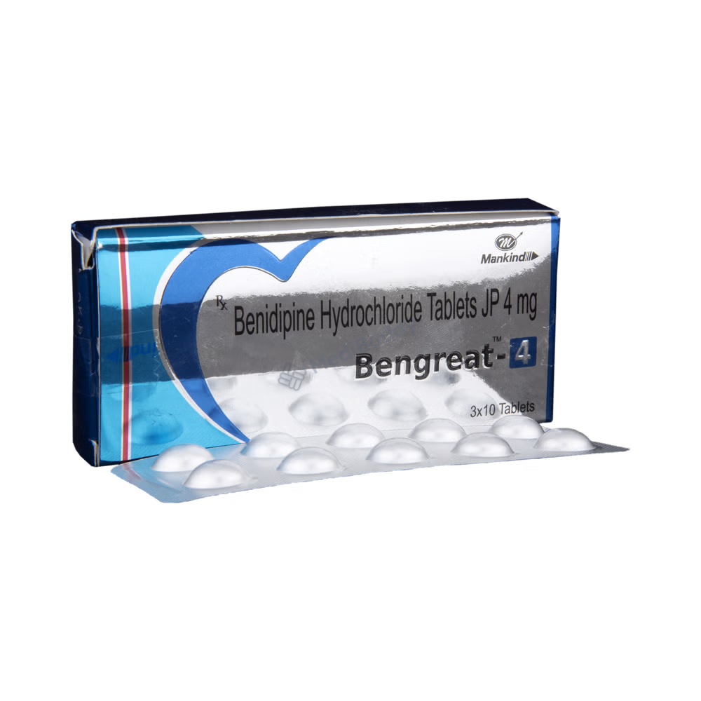 Bengreat 4 Tablet is a medication classified as a calcium channel blocker, specifically containing the active ingredient Benidipine. It is primarily used in the treatment of hypertension (high blood pressure) and angina-pectoris (chest pain related to the heart). Hypertension is a condition where the pressure of the blood against the walls of the arteries is elevated, and if left untreated, it can lead to severe complications such as heart attacks, strokes, and organ damage. Angina-pectoris is characterized by sudden and severe chest pain caused by reduced blood flow to the heart.