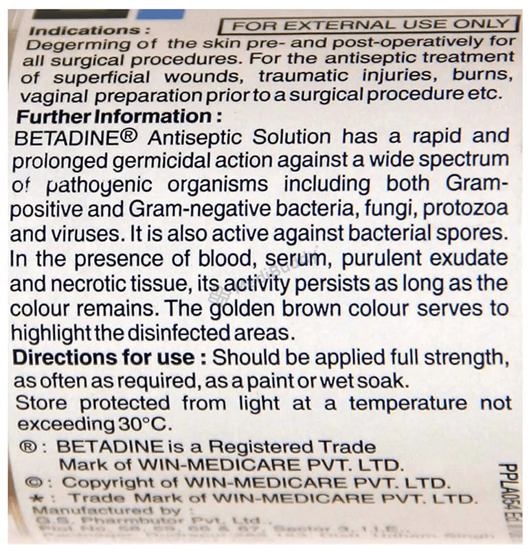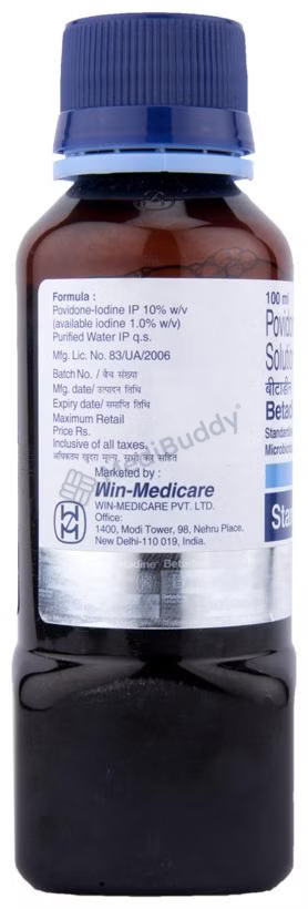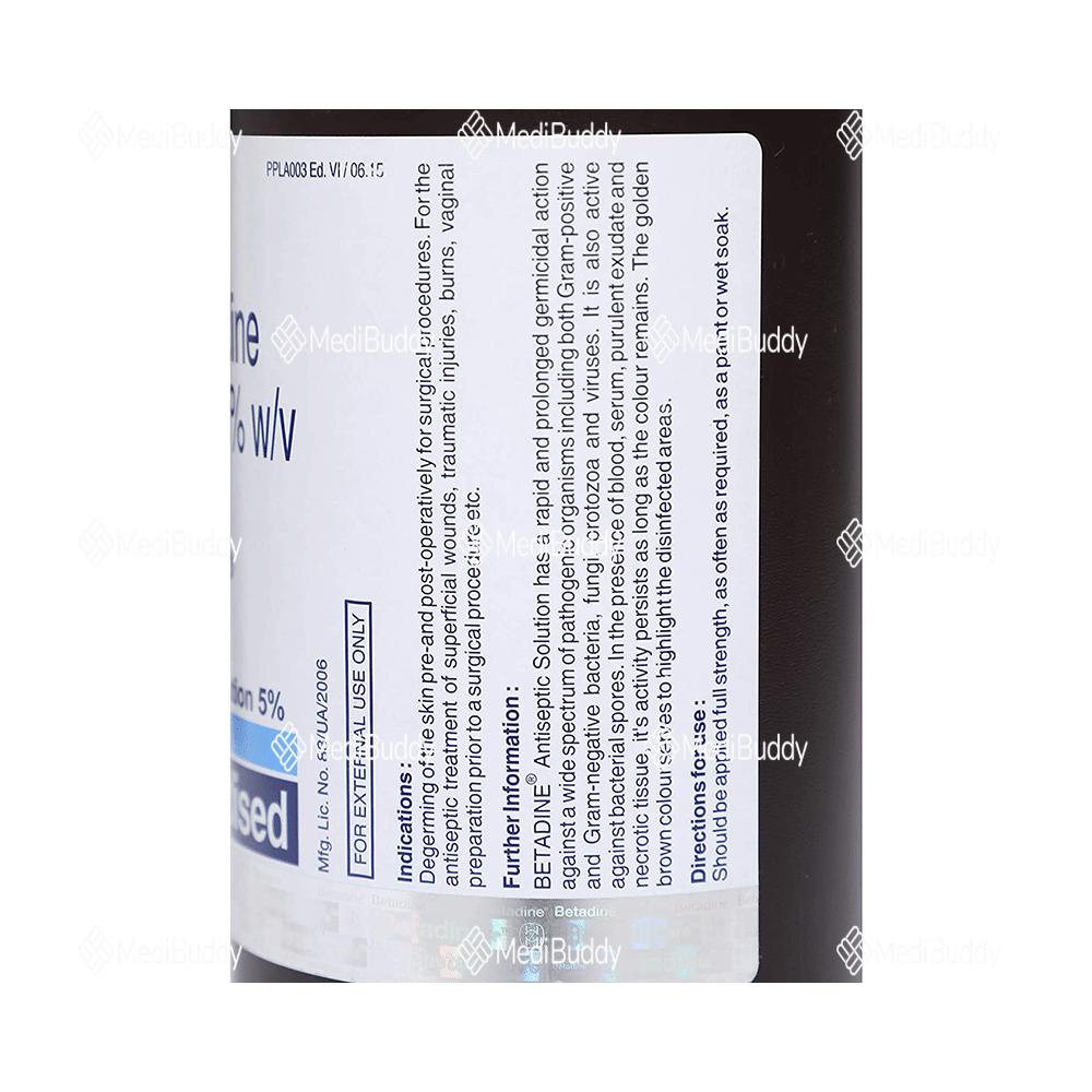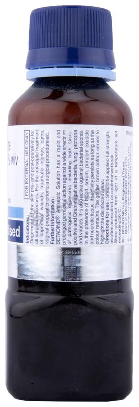Betadine 10% Solution is an antiseptic used to treat and prevent infections in wounds and cuts. By killing harmful microbes and controlling their growth, it helps prevent infections in the affected area. This versatile antiseptic is effective in preventing abrasions, cuts, and wounds from becoming infected, thanks to its slow release of iodine. It is important to keep the affected area clean and use the medicine as directed by your doctor to maximize its benefits. Side effects such as skin irritation, redness, or itching may occur, so consult with your doctor if these persist.