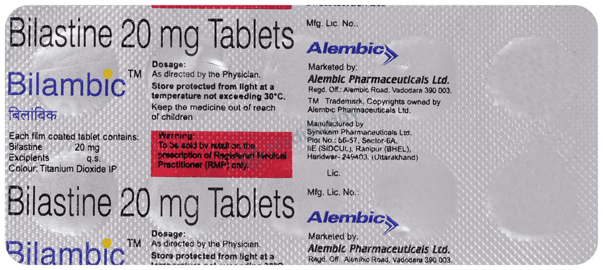 Primarily used for treating allergies, Bilambic 20mg Tablet is particularly effective against different types of allergic conditions like hay fever, perennial allergic rhinitis, and urticaria. It works as an anti-allergic medication, providing relief from symptoms such as blocked or runny nose, itchy eyes, and skin rashes. The active ingredient in Bilambic 20mg Tablet, bilastine, is an anti-histamine that targets the chemical messenger histamine involved in allergic reactions. By blocking the effects of histamine, Bilambic 20mg Tablet helps in managing and reducing allergy symptoms effectively.