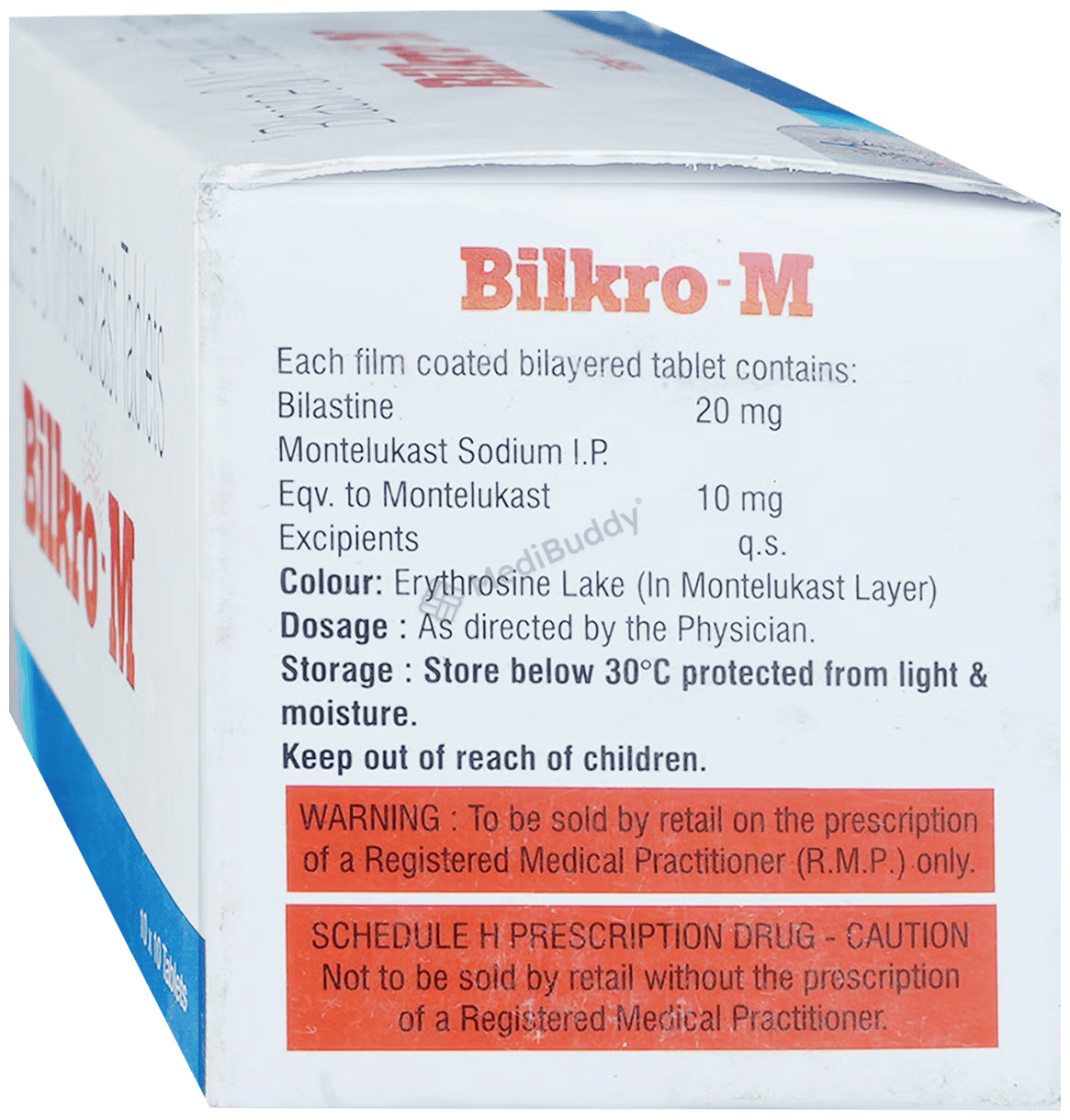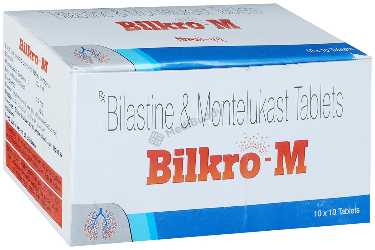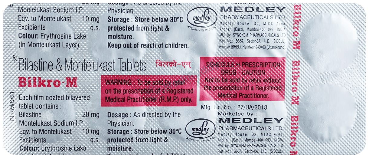 On the other hand, Bilastine, an antihistamine, works by blocking the action of histamine, a key substance involved in allergic reactions. By inhibiting histamine, Bilastine helps to alleviate a range of allergy symptoms, including sneezing, runny nose, watery eyes, itching, swelling, congestion, and stiffness. This dual-action formula of Bilkro M 20mg/10mg Tablet, combining Montelukast and Bilastine, offers comprehensive relief from allergic symptoms, making it a valuable option for individuals seeking effective treatment for allergies and related conditions.