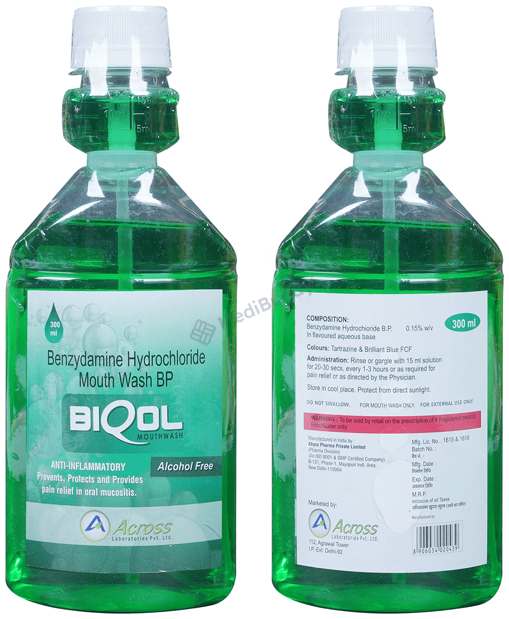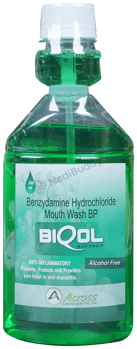 Biqol Mouth Wash Alcohol Free is a medicine designed to help relieve pain, discomfort, and inflammation in the mouth, gums, and throat. It works to reduce pain and swelling while also aiding in the healing process. This mouthwash is categorized as a pain reliever and is primarily used to treat conditions such as oral mucositis, which is inflammation often caused by treatments like radiotherapy or chemotherapy.