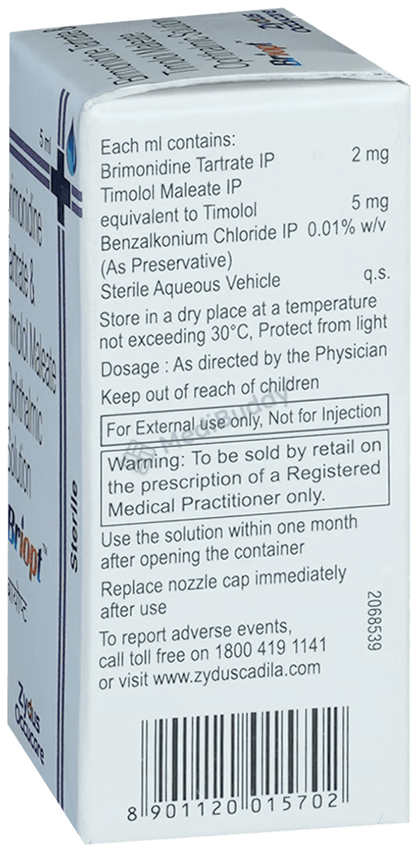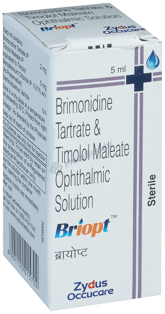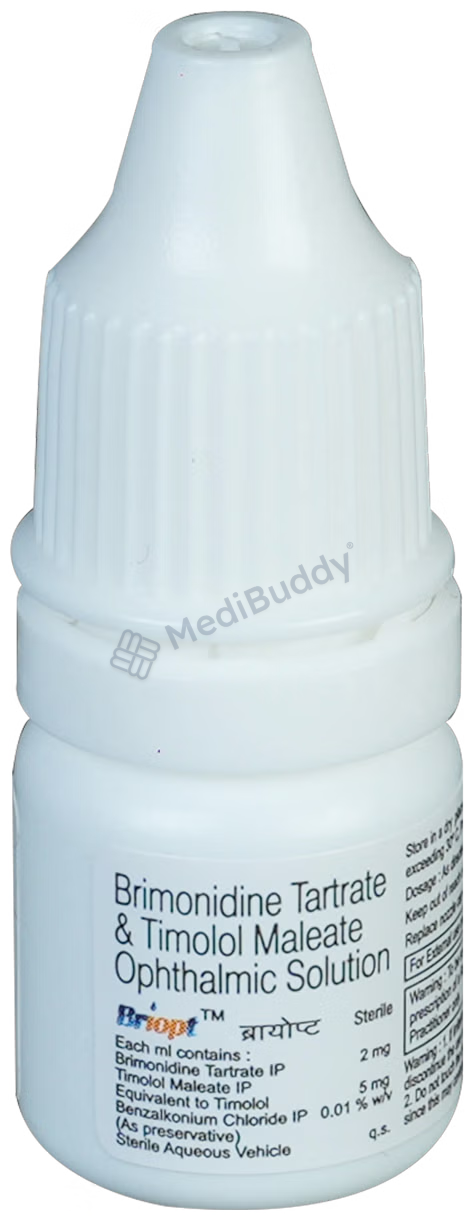 Briopt Eye Drop is available in a 5 ml bottle and is a combination of two active ingredients, Brimonidine and Timolol. Brimonidine acts by narrowing blood vessels to decrease the flow of aqueous humor, while Timolol, a beta-blocker, reduces the secretion of aqueous humor by acting on the ciliary body in the eye, resulting in lowered eye pressure. Your doctor will determine the frequency of Briopt Eye Drop usage based on your medical condition.