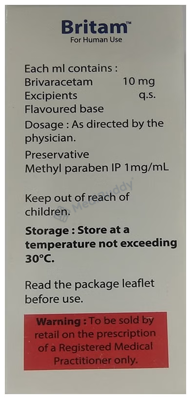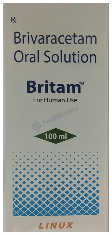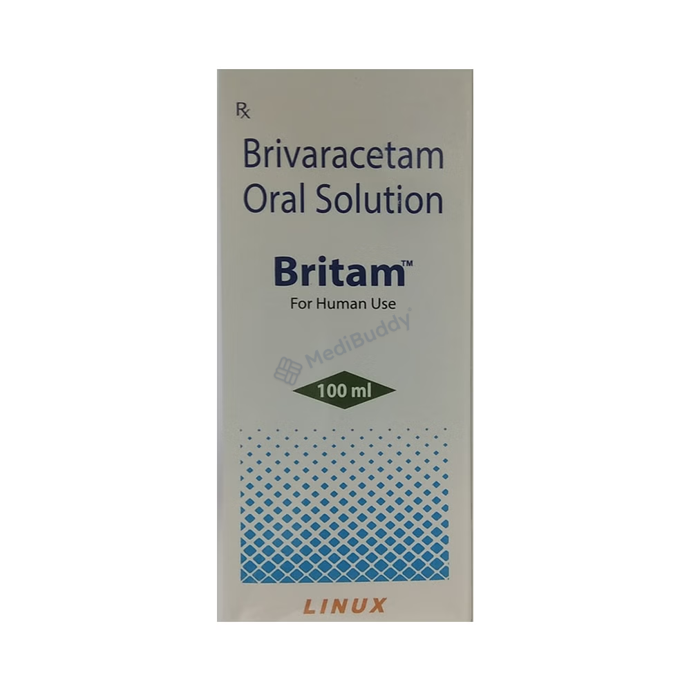 Before starting Britam Oral Solution, inform your doctor about any liver or kidney issues, depression, thoughts of self-harm, pregnancy, or breastfeeding. Britam 10 Oral Solution 100 ml, a variant of the medication, specifically targets partial-onset seizures in patients with epilepsy one month of age and older. It contains Brivaracetam, which helps reduce abnormal nerve activity in the brain that leads to seizures.