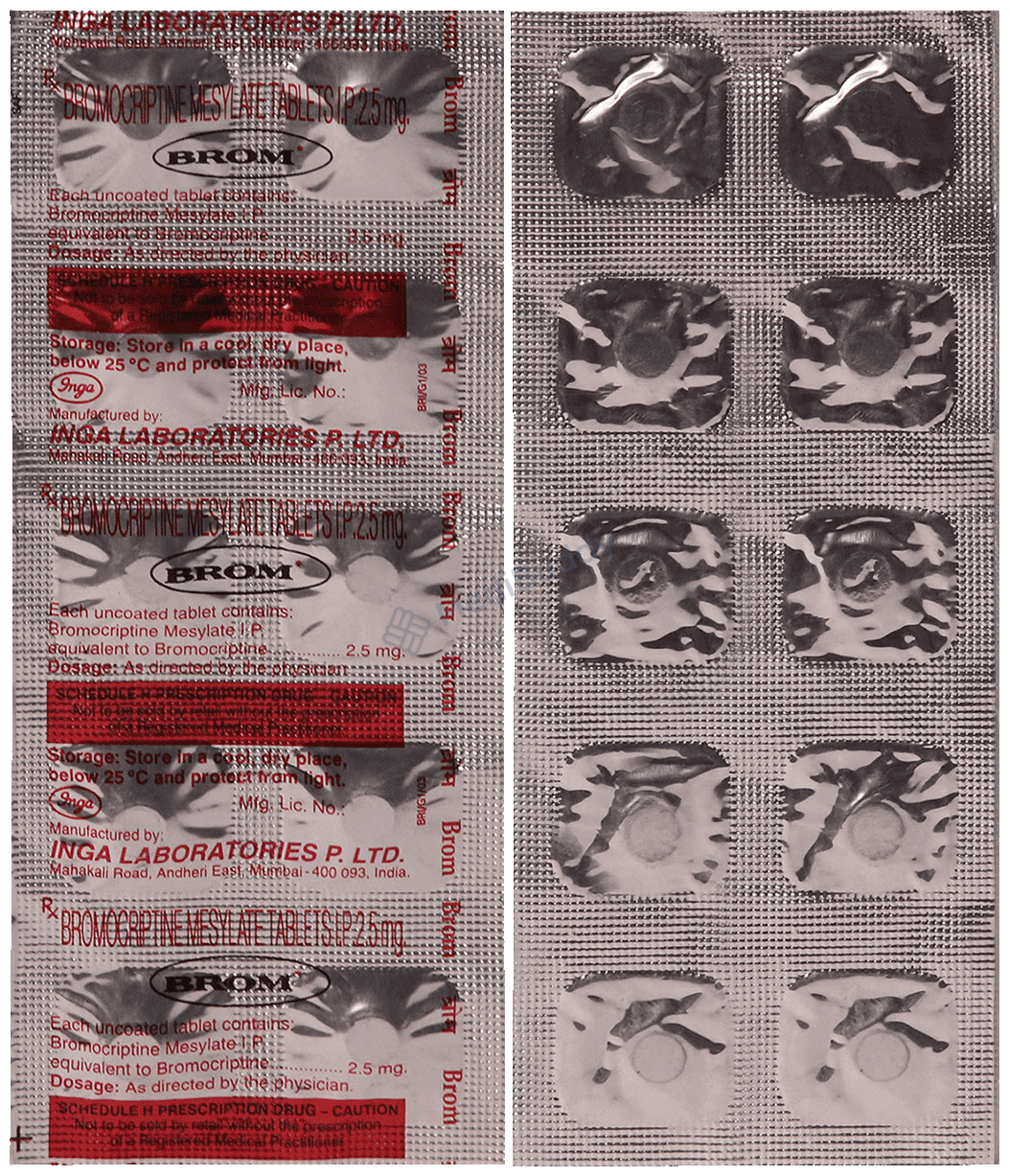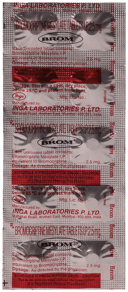Brom 2.5mg Tablet is used to treat high levels of prolactin in the body, female infertility, and acromegaly. High levels of prolactin can lead to breast growth and milk secretion in females, which the medicine helps to control. In female infertility, the tablet regulates ovulation and menstrual cycles. Acromegaly, a condition caused by excess growth hormone, is treated by reducing growth hormone levels with this medication. It is important to follow the doctor's instructions for best results.