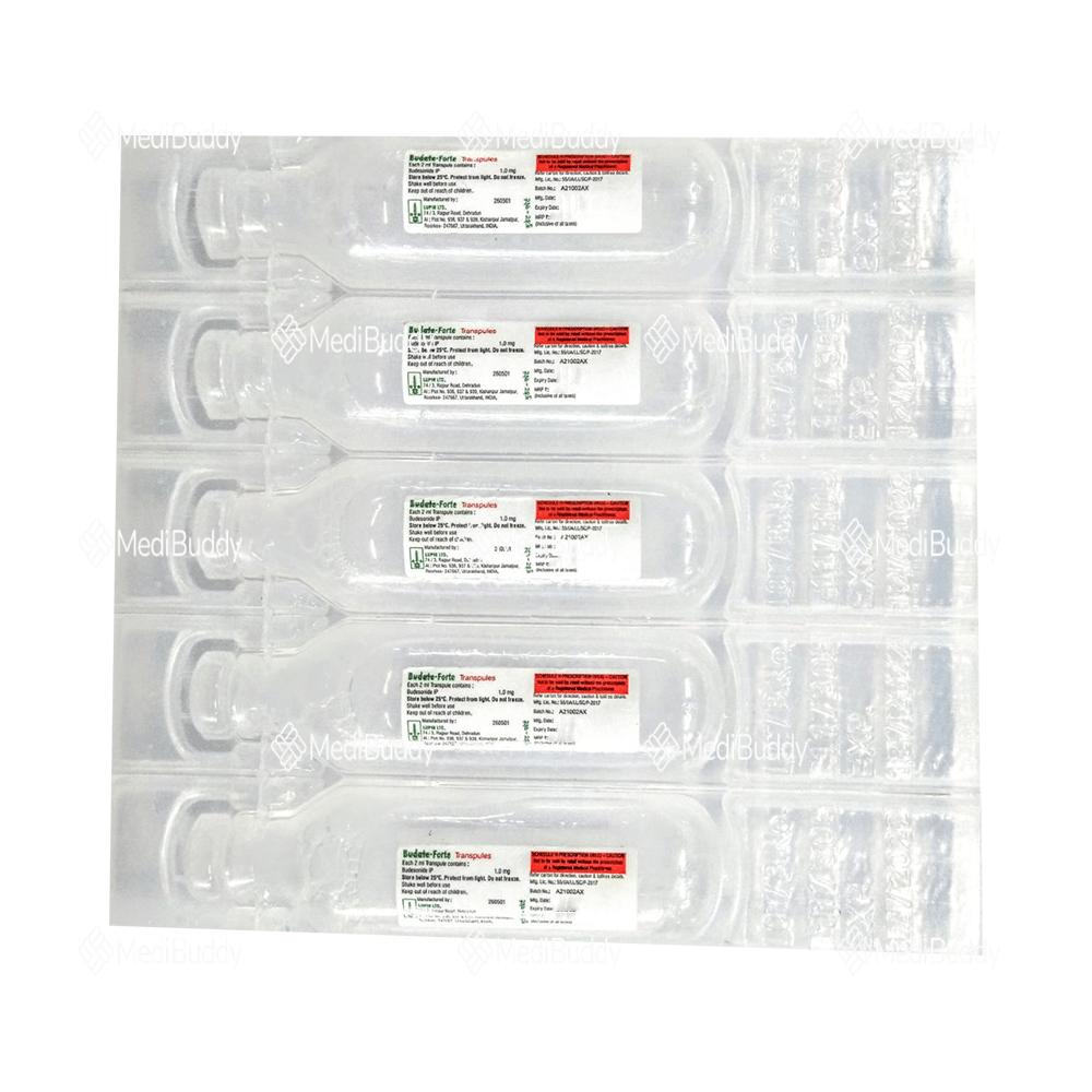 Budate Forte Transpules 2ml is a medication used to prevent asthma symptoms like wheezing and shortness of breath. It is classified as a steroid and is referred to as a "preventer" because it helps in controlling asthma over time. It's important to note that this medicine will not stop an ongoing asthma attack, so it's recommended to have a fast-acting "reliever" inhaler for such situations.