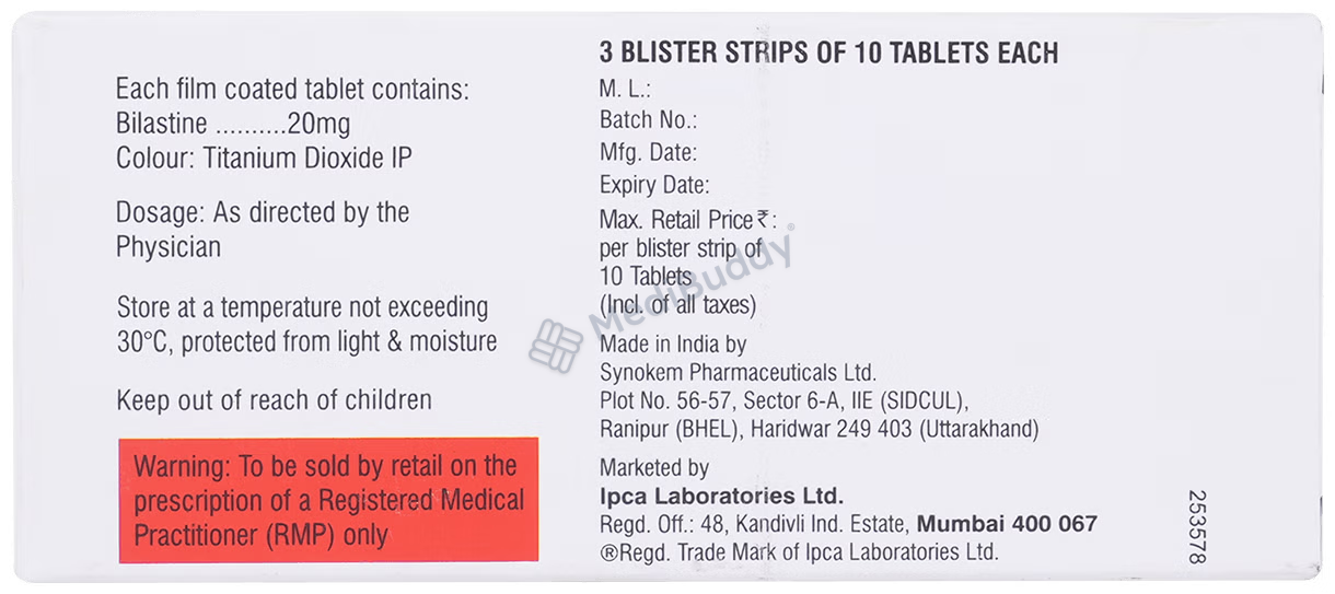 Primarily used for treating allergies, Bularid-L Tablet is particularly effective against different types of allergic conditions like hay fever, perennial allergic rhinitis, and urticaria. It works as an anti-allergic medication, providing relief from symptoms such as blocked or runny nose, itchy eyes, and skin rashes. The active ingredient in Bularid-L Tablet, bilastine, is an anti-histamine that targets the chemical messenger histamine involved in allergic reactions. By blocking the effects of histamine, Bularid-L Tablet helps in managing and reducing allergy symptoms effectively.