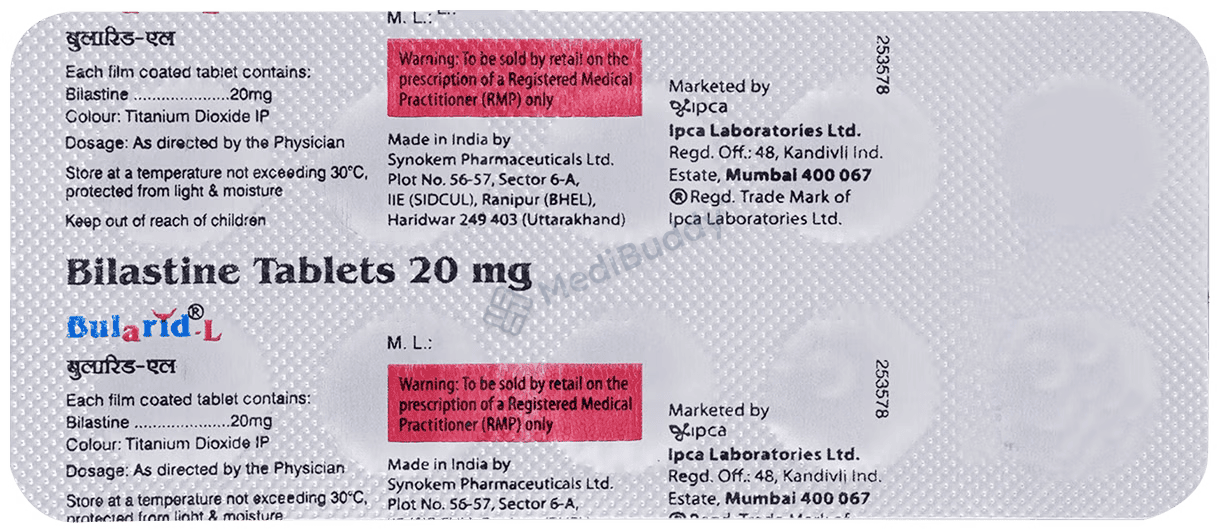 The active ingredient in Bularid-L Tablet is bilastine, an antihistamine that works by blocking the effects of histamine, a chemical messenger involved in allergic reactions. By inhibiting histamine, Bularid-L helps relieve discomfort and unpleasant symptoms associated with allergic conditions like nasal congestion, itchy eyes, and skin rashes.