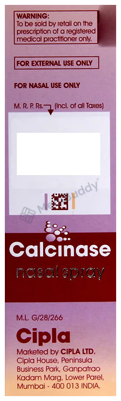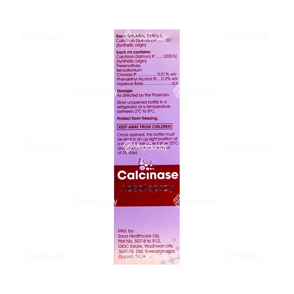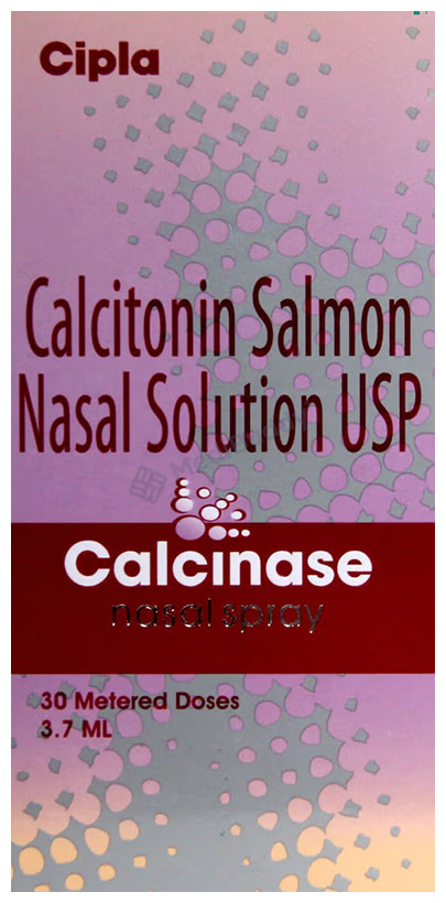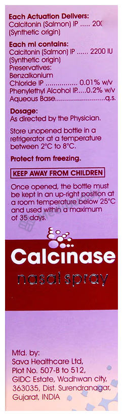 Calcinase Nasal Spray is a medication designed to treat osteoporosis in postmenopausal women, a condition that weakens bones and increases the risk of fractures. It contains Calcitonin, a hormone that helps prevent bone breakdown and enhances bone density, ultimately making the bones stronger. Additionally, it can be used to alleviate bone pain associated with Paget's disease.