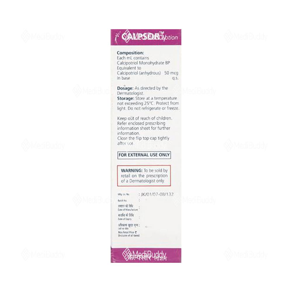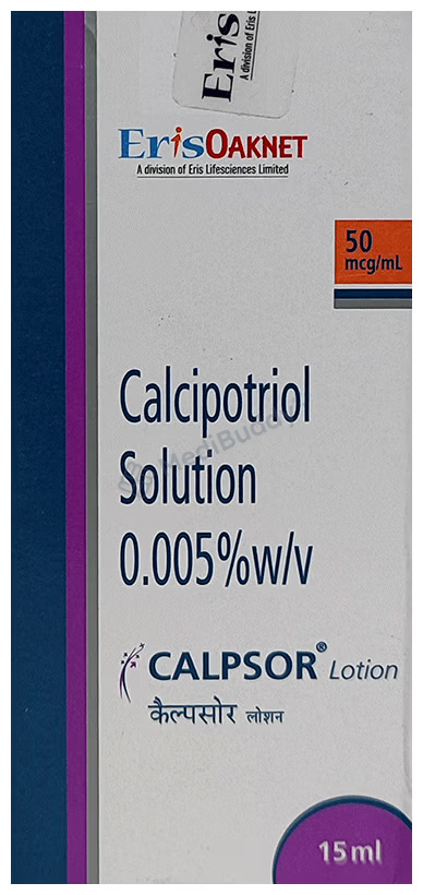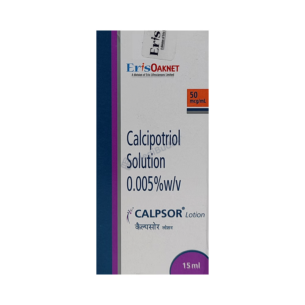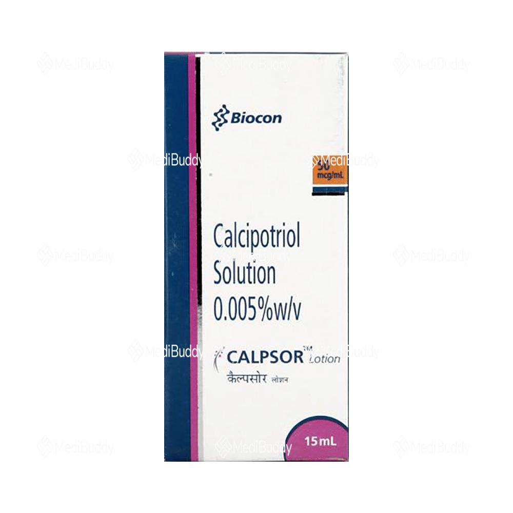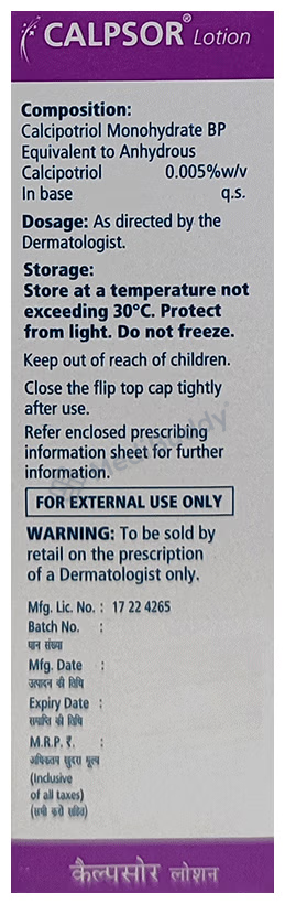 Calpsor Lotion 15 ml belongs to the class of antipsoriatic agents and is specifically designed to address psoriasis symptoms such as raised red patches and scaly areas. The formulation contains calcipotriol, a synthetic form of Vitamin D that regulates the overproduction of skin cells, thereby alleviating inflammation and scaly patches. Adhering to the prescribed usage guidelines, including precautions for avoiding contact with eyes, nose, or mouth, and disclosing relevant medical history to your doctor, ensures safe and effective use of the medication.