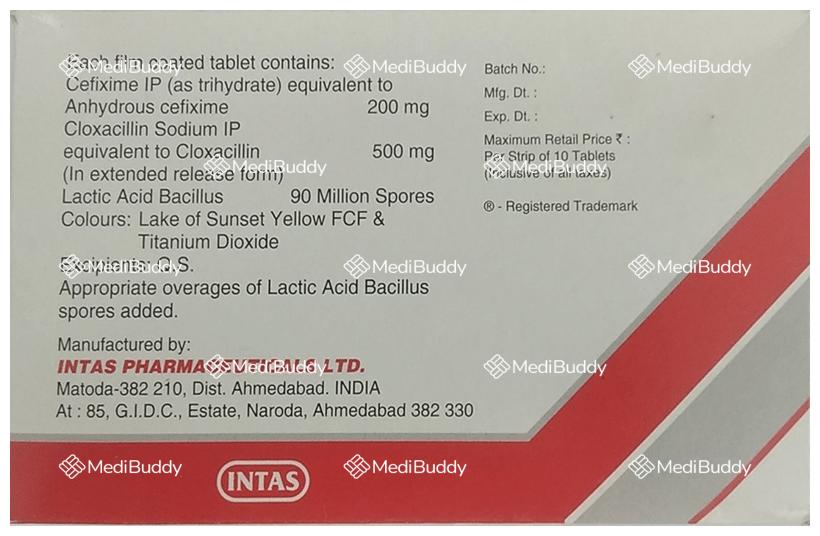 The tablet contains Cefixime, Cloxacillin, and Lactobacillus sporogenes. Cefixime functions by blocking chemicals released by bacteria's cell walls, thus destroying the bacterial cell wall. Cloxacillin interferes with the final stage of bacterial cell wall synthesis. Lactobacillus sporogenes helps maintain a healthy balance of beneficial bacteria in the gut to manage diarrhea caused by antibiotics or infections.