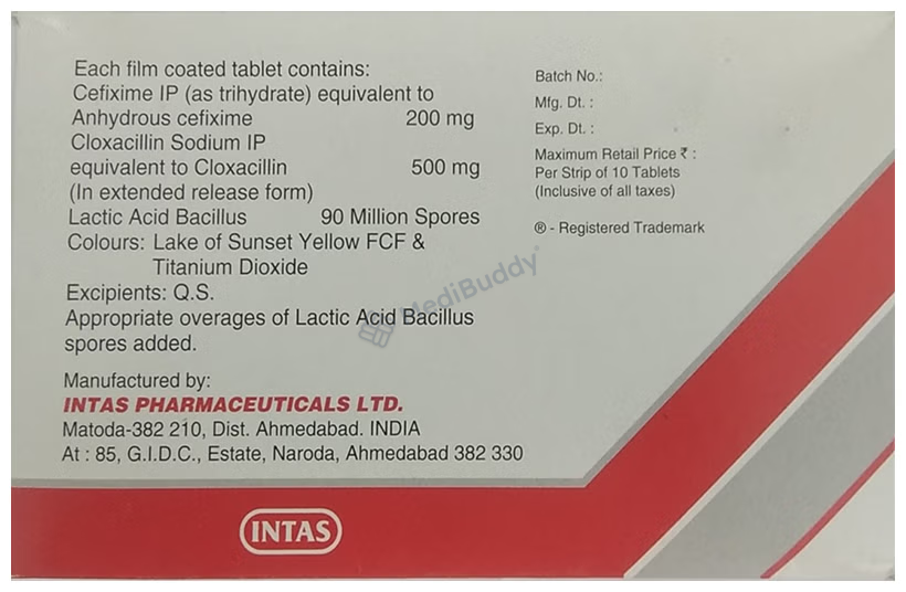 Cefixime(200mg) + Cloxacillin(500mg) + Lactobacillus(90Million spores)