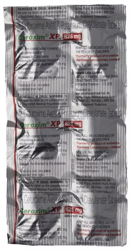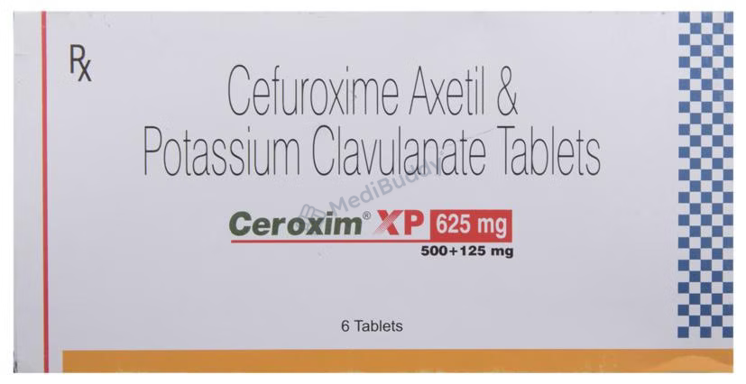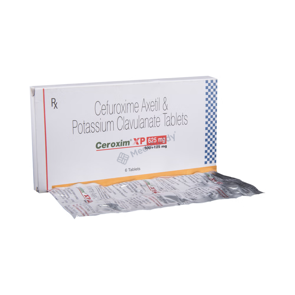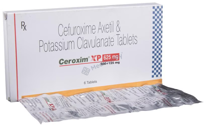 Ceroxim XP 625mg Tablet is a combination of two antibiotics, Cefuroxime and Clavulanic Acid, classified as Antibiotics and Beta-lactamase inhibitors, respectively. These components work together to combat various bacterial infections such as throat infections, ear infections, sinus infections, sexually transmitted diseases like gonorrhea, Lyme disease, blood infections, inflammation of the brain and spinal cord, respiratory infections, skin infections, urinary tract infections, and bone and joint infections. The medication is also used in post-surgery switch therapy when a patient's condition improves from intravenous to oral medication.